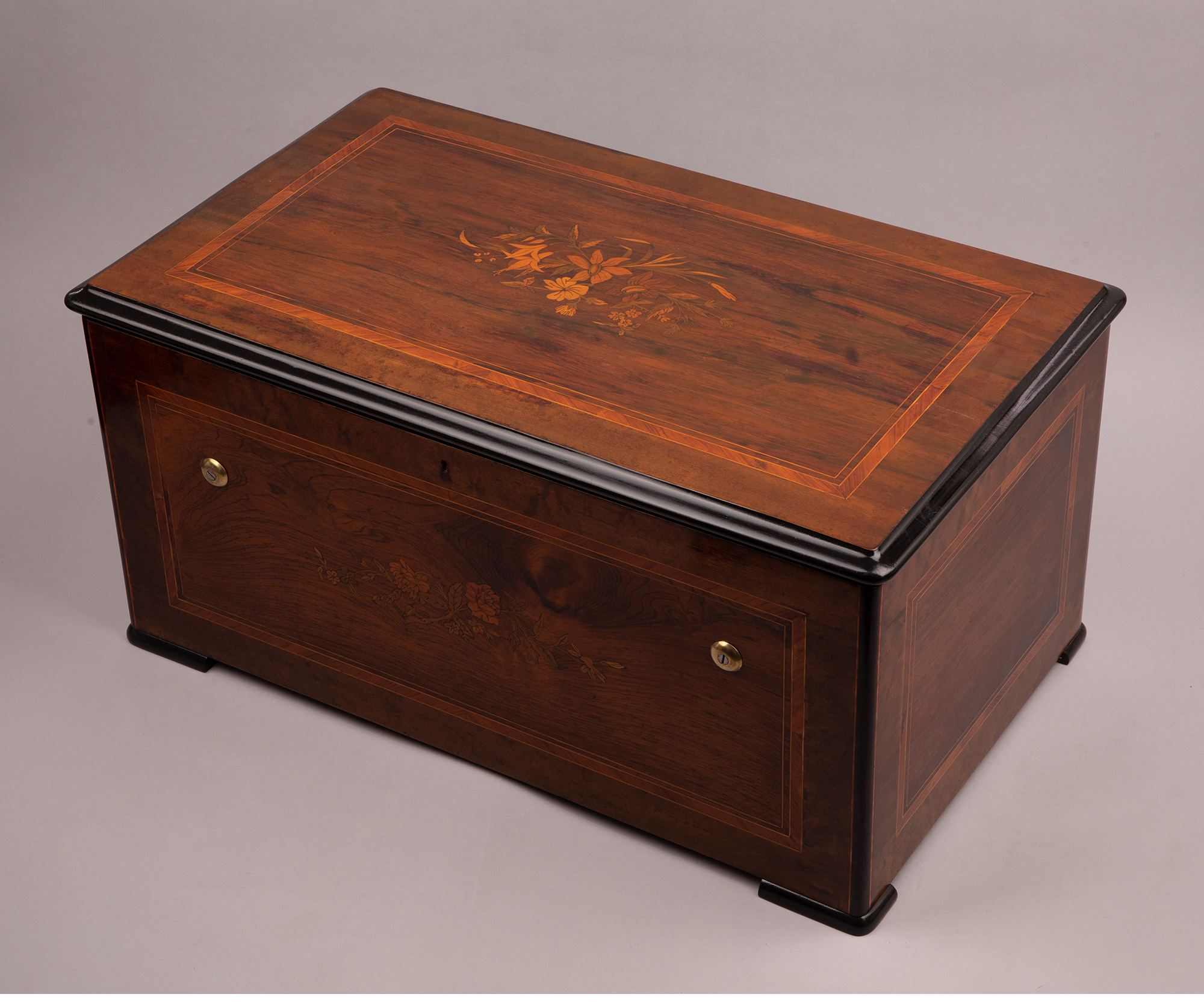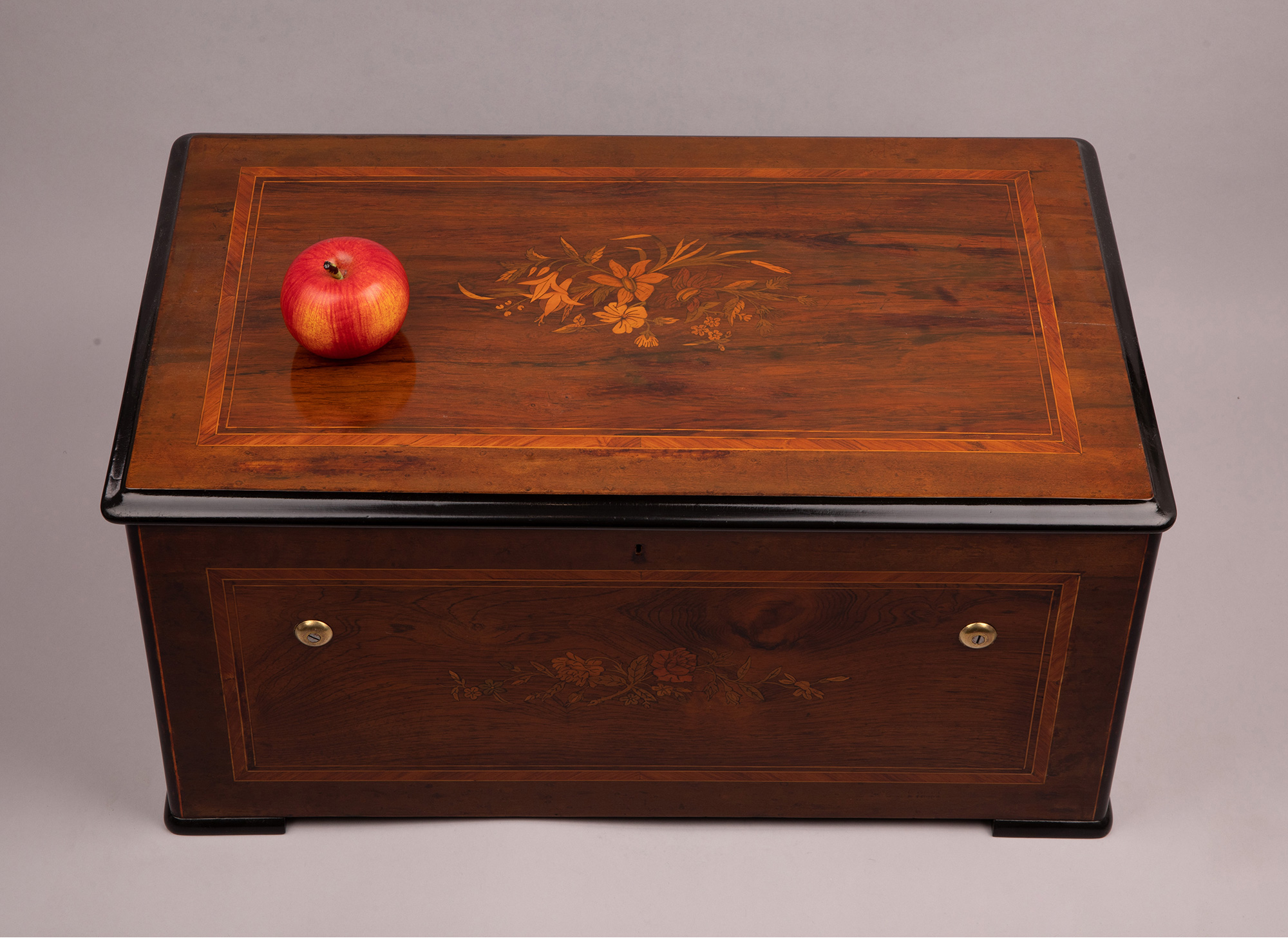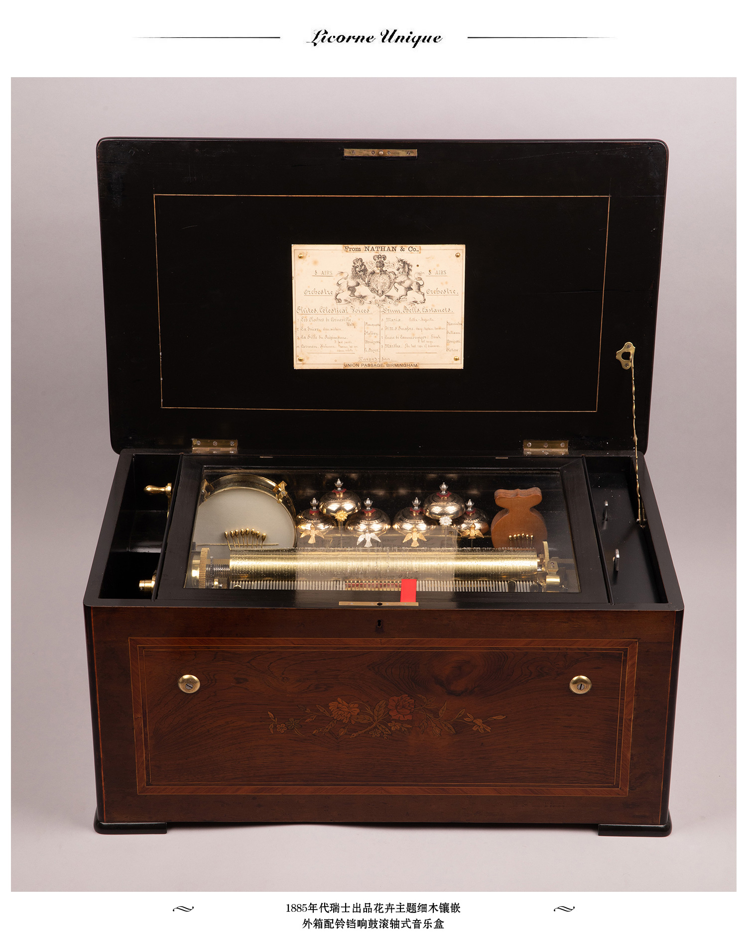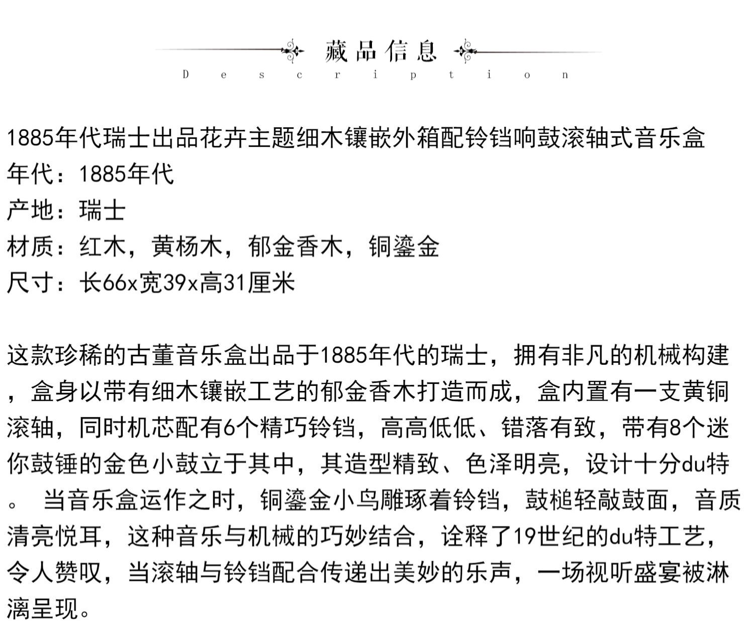 独角鹿西洋古董瑞士花卉主题细木镶嵌外箱配铃铛响鼓滚轴式音乐盒
