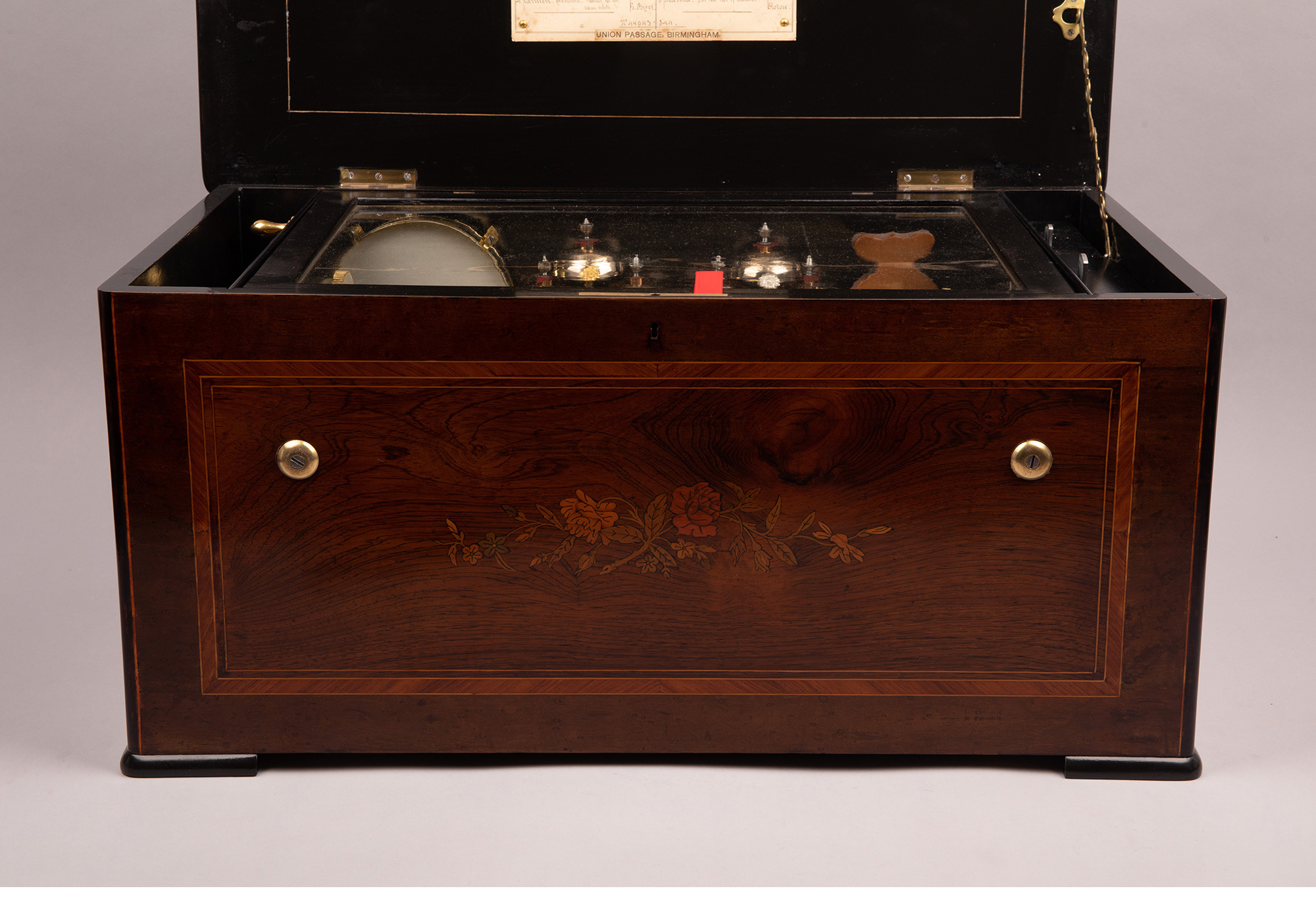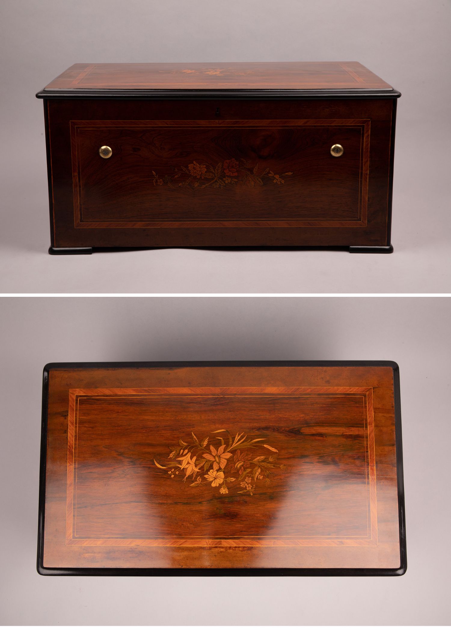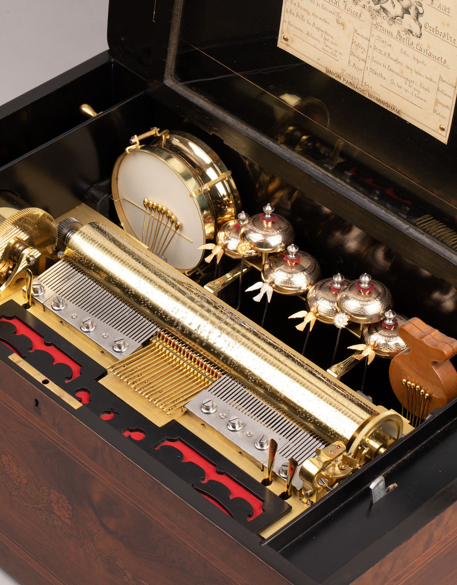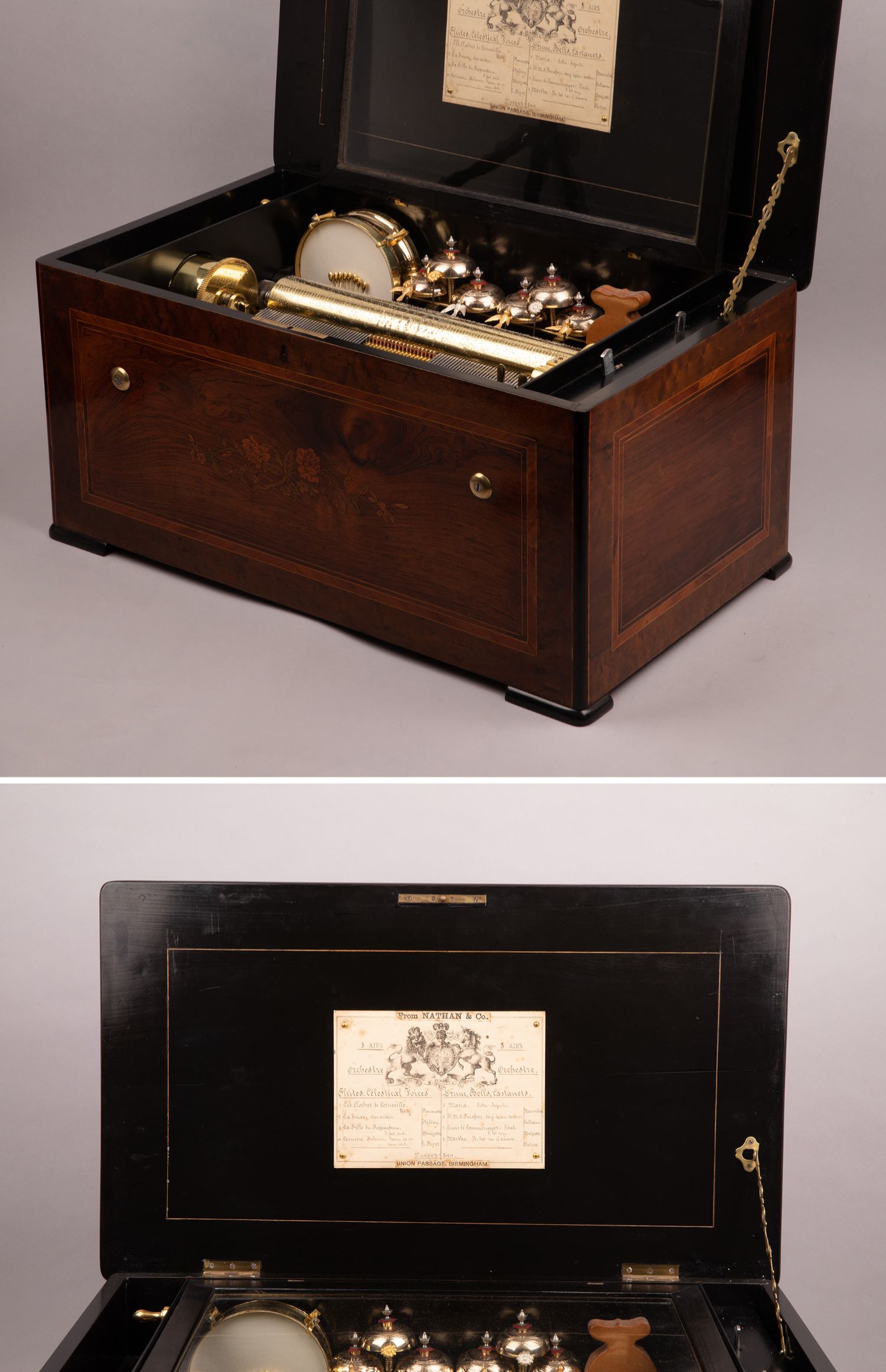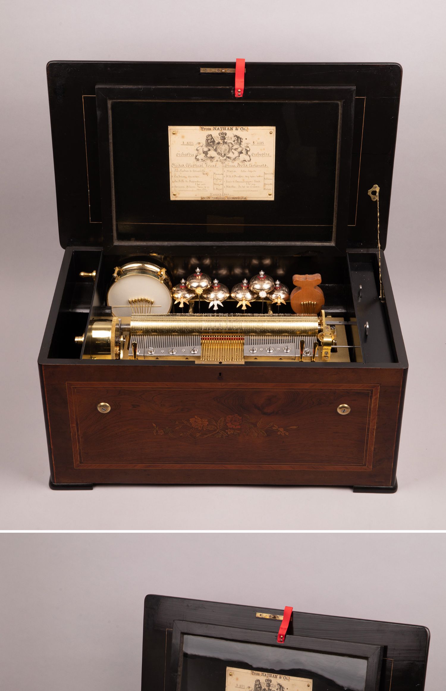独角鹿西洋古董瑞士花卉主题细木镶嵌外箱配铃铛响鼓滚轴式音乐盒