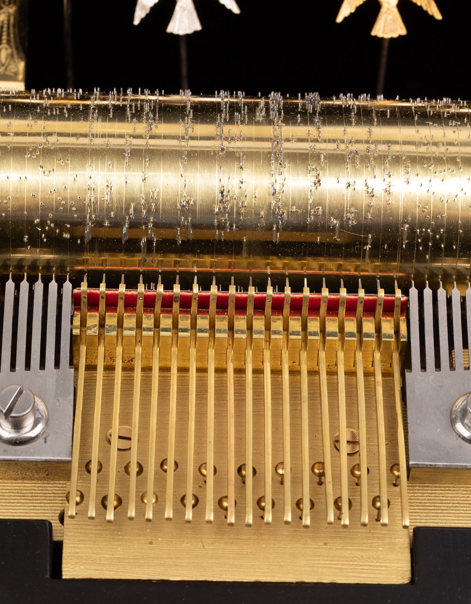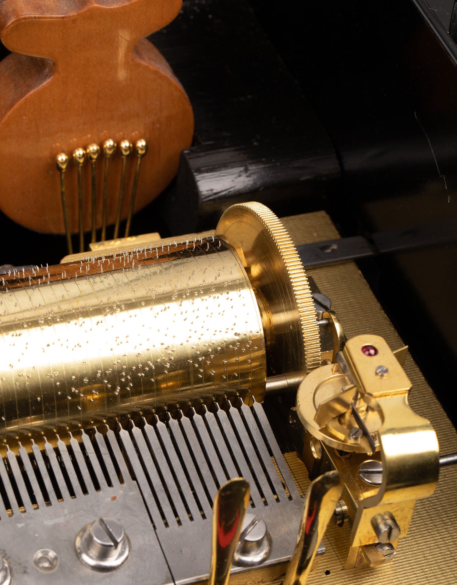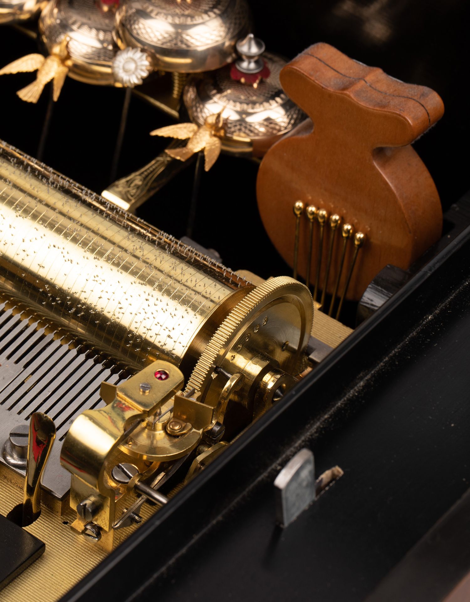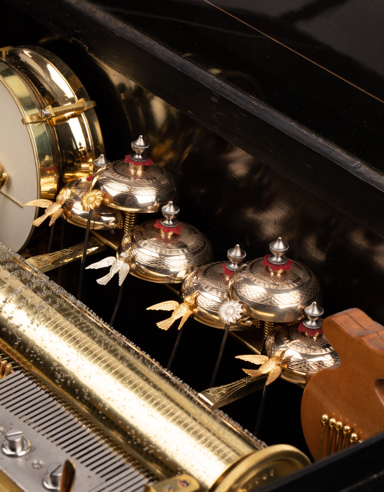 独角鹿西洋古董瑞士花卉主题细木镶嵌外箱配铃铛响鼓滚轴式音乐盒