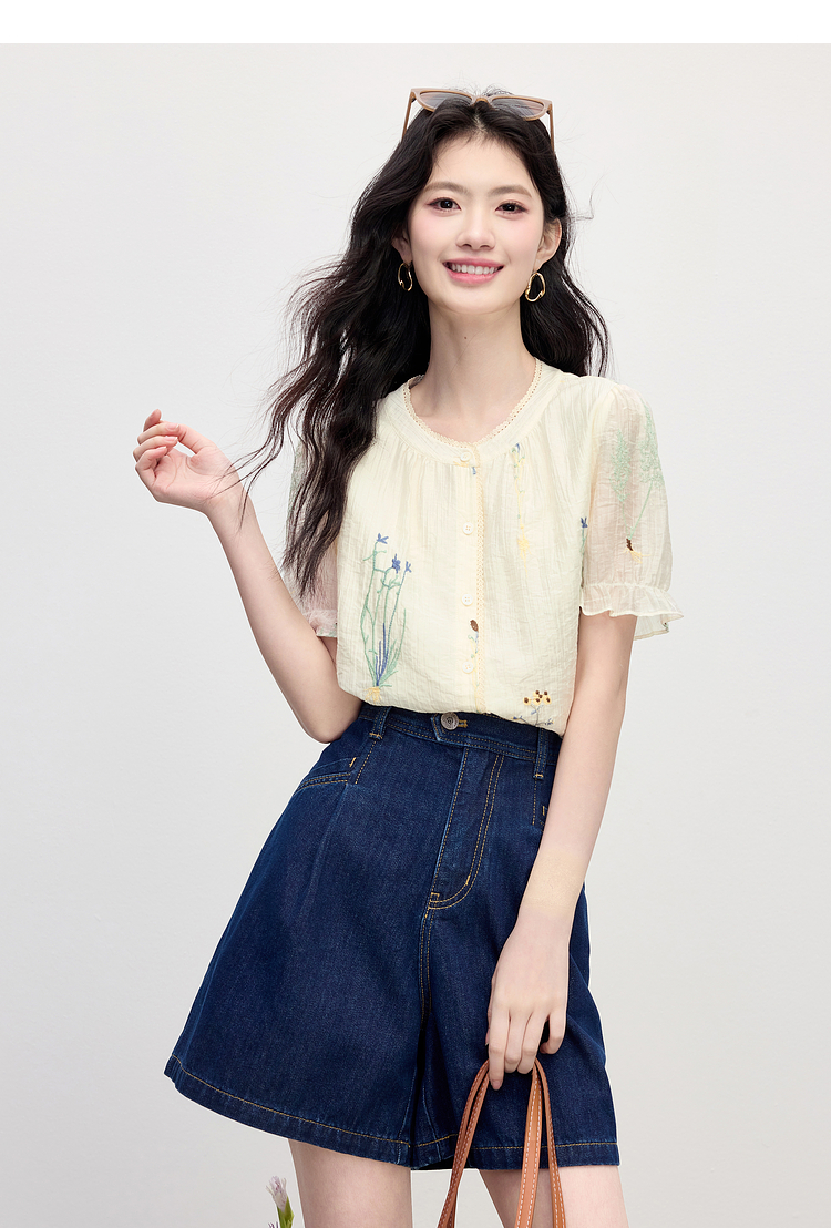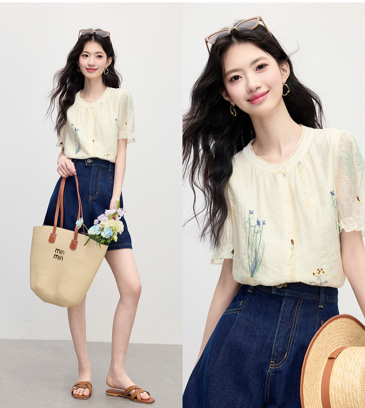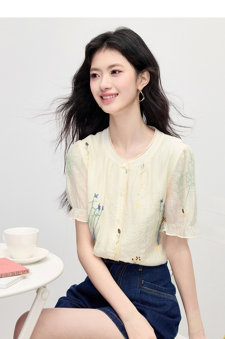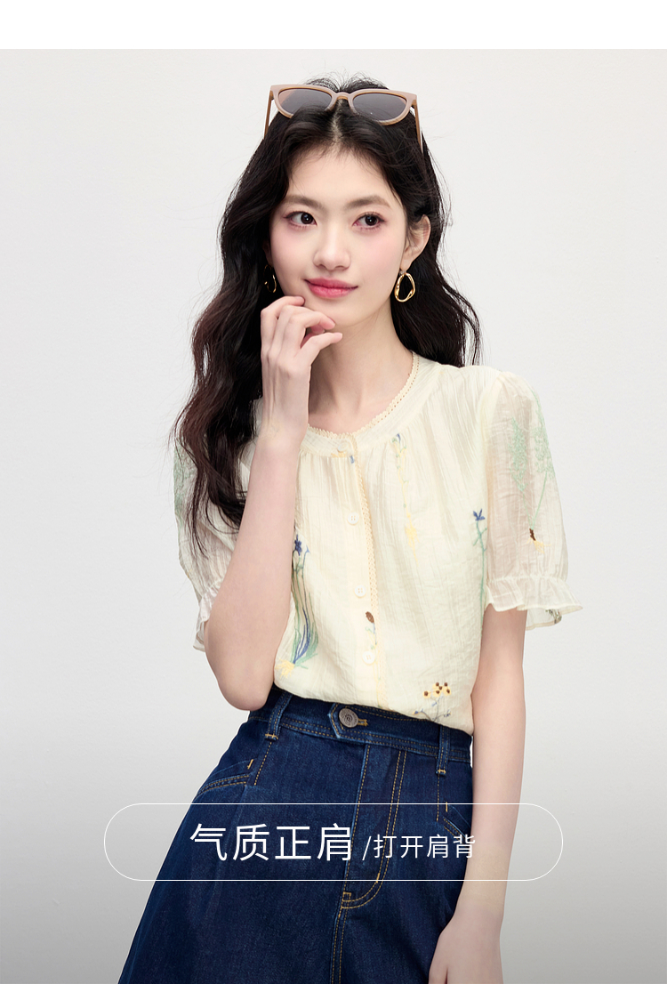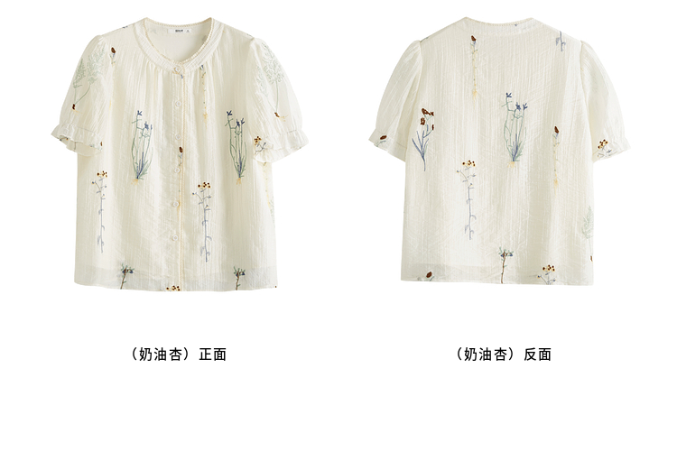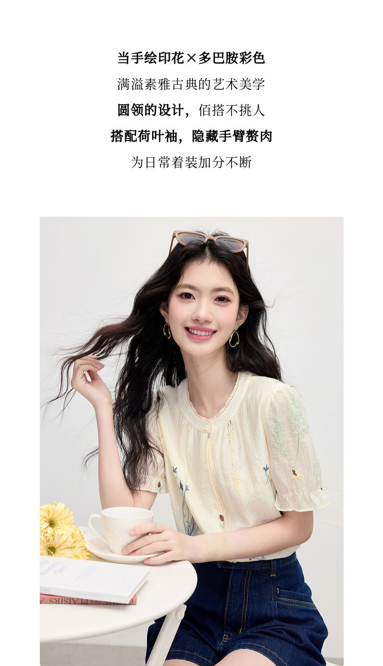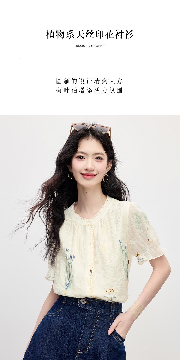 【周末秒杀】熙世界天丝印花圆领衬衫女2025夏季新款荷叶短袖气质正肩小衫上衣