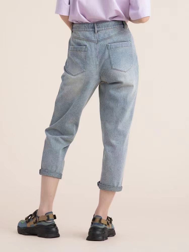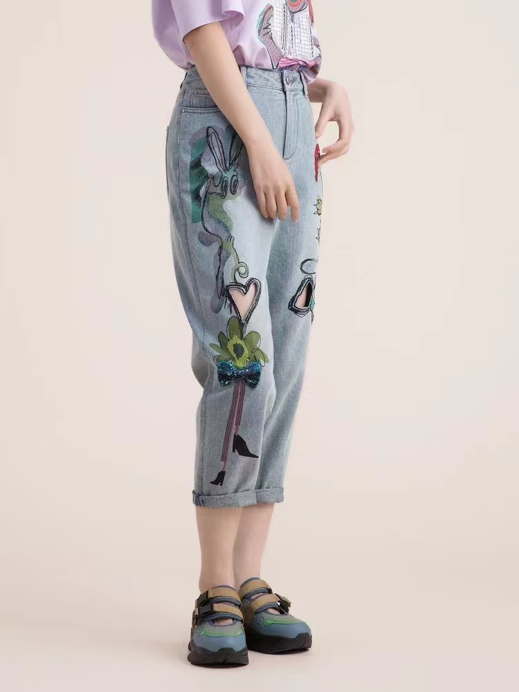 特点:经典刺绣萝卜裤,高腰设计,拉长身材比例,包容性强,很好的修饰腿型!