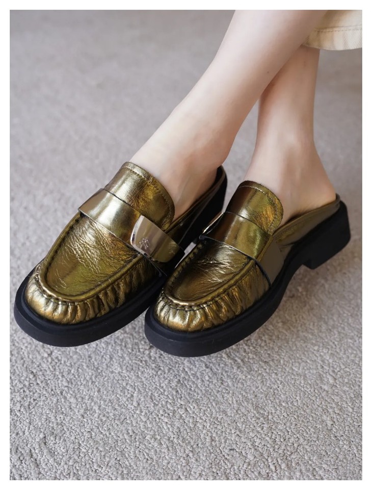 上脚chao轻盈!近4cm增高时髦一脚蹬乐福鞋!春夏新款懒人鞋!舒适好走轻松增高 金属褶皱头层牛皮工艺+定制chao轻盈鞋底,橡胶防滑大底(少量现货拍下立发)