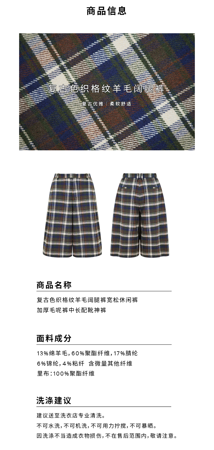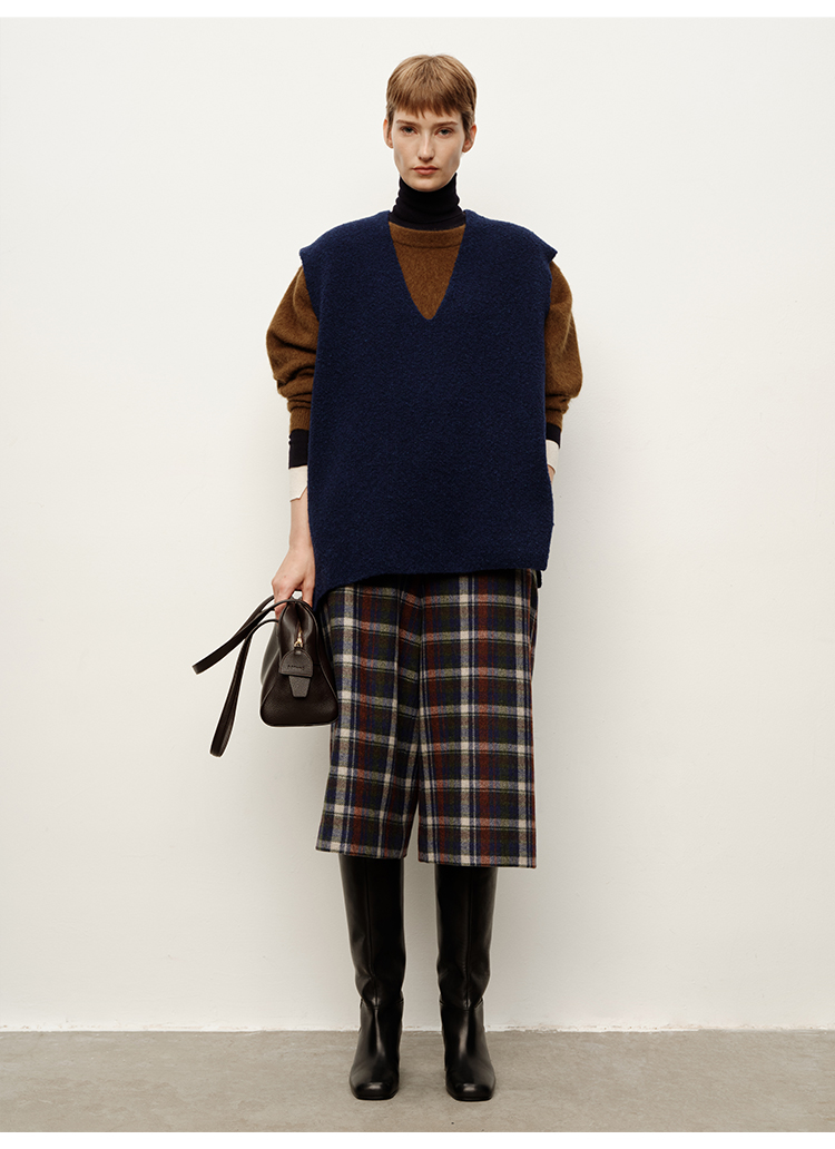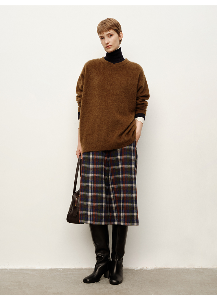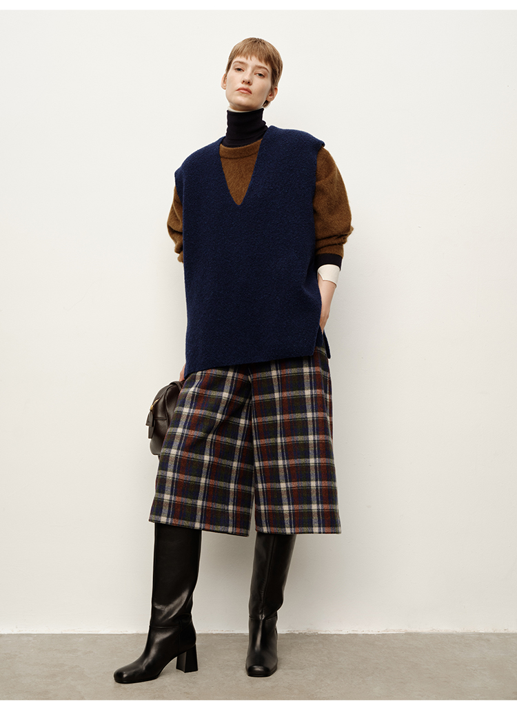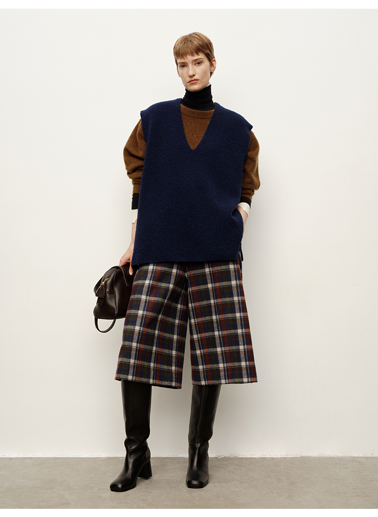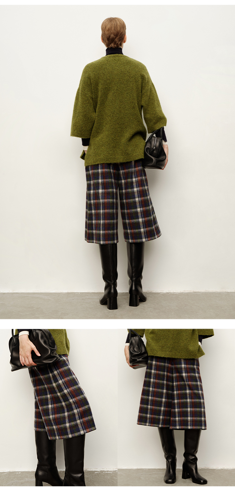 HIDEMI 复古色织格纹羊毛阔腿宽松休闲裤加厚毛呢中长裤配靴神裤