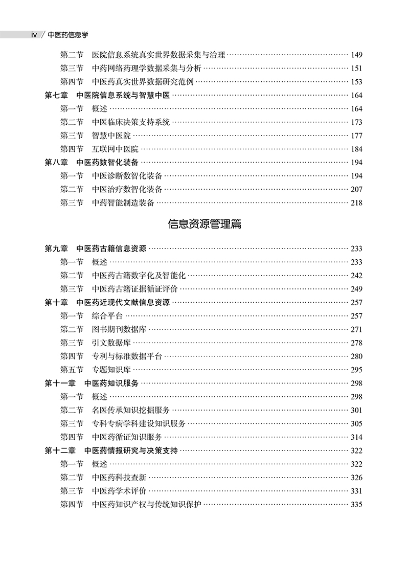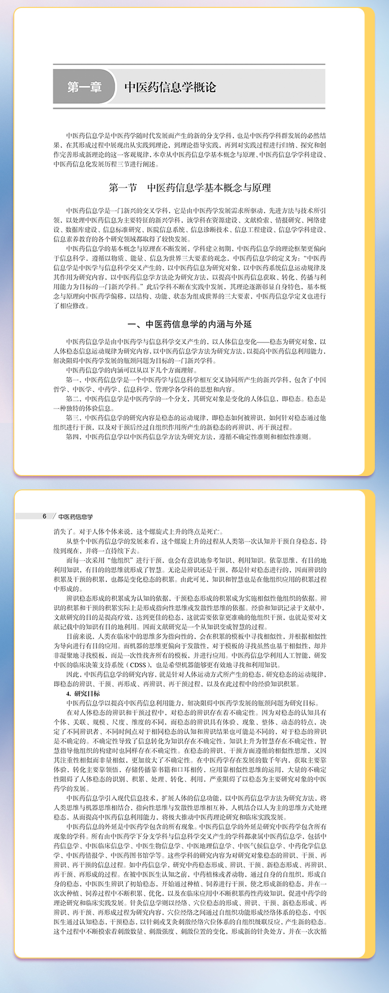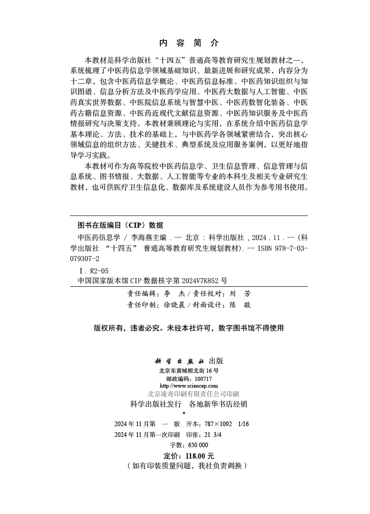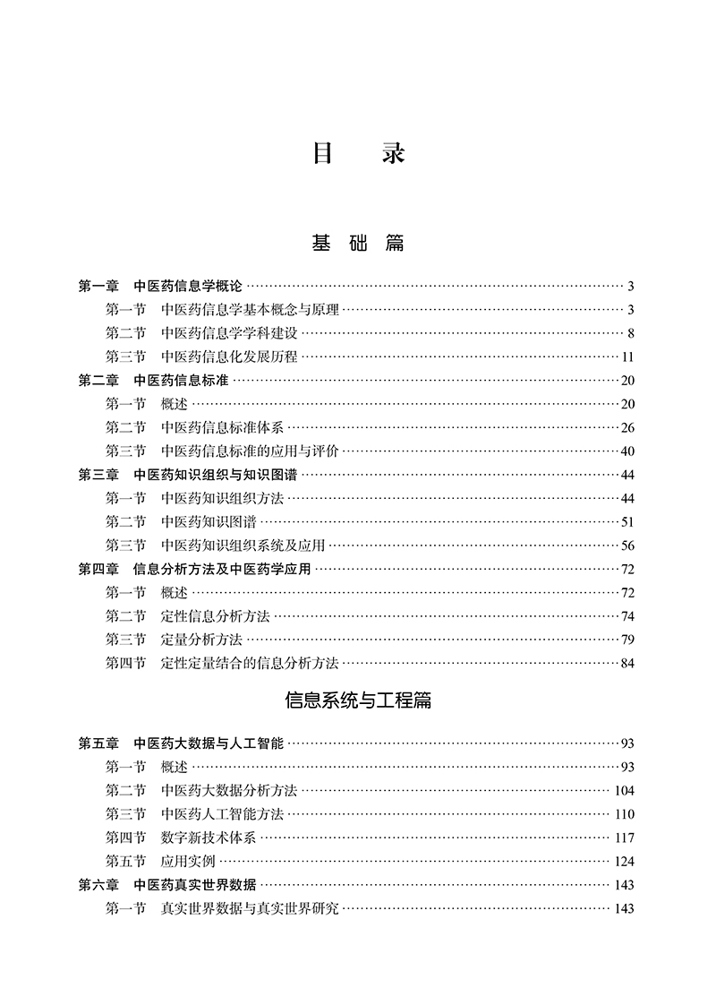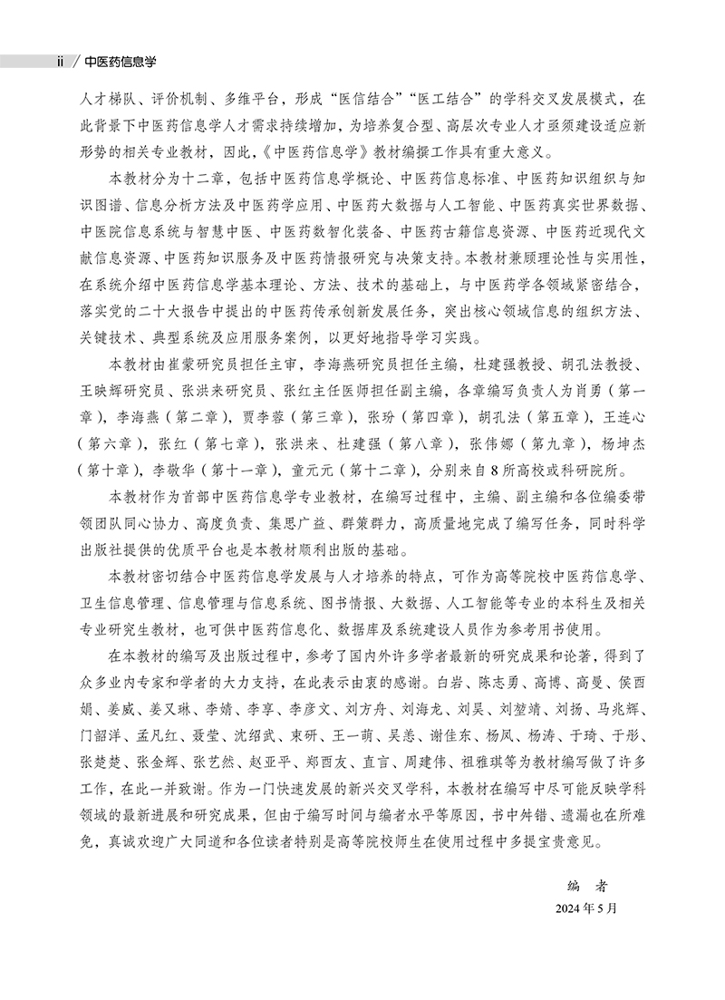 本教材是科学出版社“十四五”普通高等教育研究生规划教材之一,系统梳理了中医药信息学领域基础知识、最新进展和研究成果,内容分为十二章,包含中医药信息学概论、中医药信息标准、中医药知识组织与知识图谱、信息分析方法及中医药学应用、中医药大数据与人工智能、中医药真实世界数据、中医院信息系统与智慧中医、中医药数智化装备、中医药古籍信息资源、中医药近现代文献信息资源、中医药知识服务及中医药情报研究与决策支持。本教材兼顾理论与实用,在系统介绍中医药信息学基本理论、方法、技术的基础上,与中医药学各领域紧密结合,突出核心领域信息的组织方法、关键技术、典型系统及应用服务案例,以更好地指导学习实践。