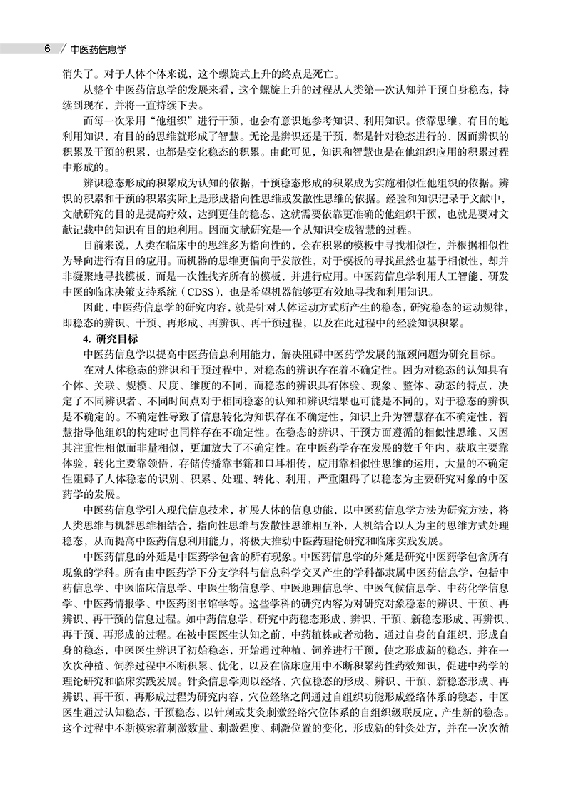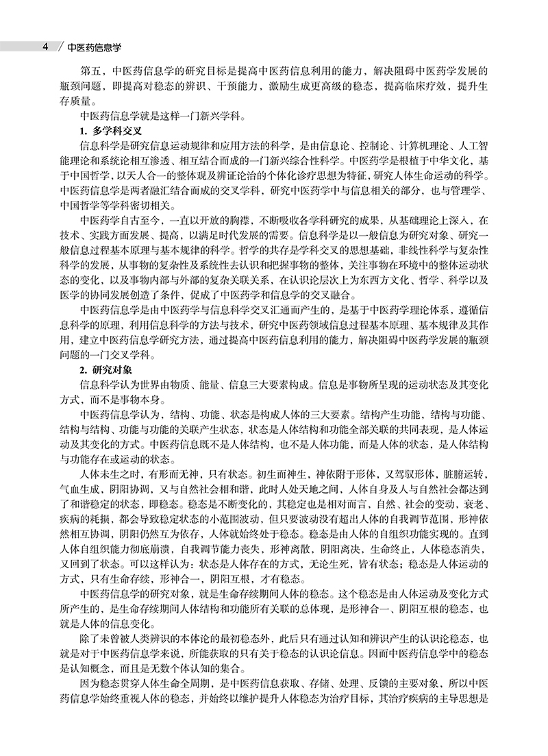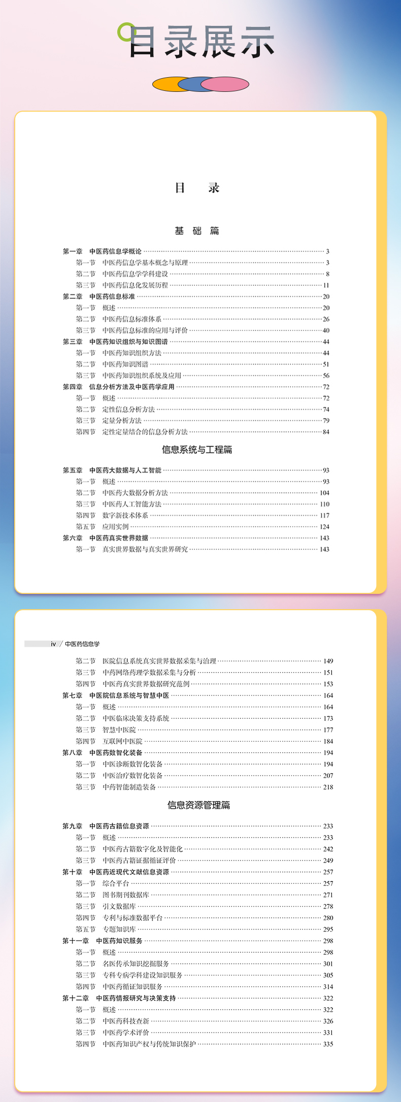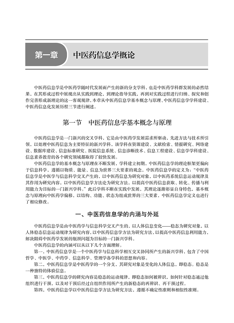 本教材是科学出版社“十四五”普通高等教育研究生规划教材之一,系统梳理了中医药信息学领域基础知识、最新进展和研究成果,内容分为十二章,包含中医药信息学概论、中医药信息标准、中医药知识组织与知识图谱、信息分析方法及中医药学应用、中医药大数据与人工智能、中医药真实世界数据、中医院信息系统与智慧中医、中医药数智化装备、中医药古籍信息资源、中医药近现代文献信息资源、中医药知识服务及中医药情报研究与决策支持。本教材兼顾理论与实用,在系统介绍中医药信息学基本理论、方法、技术的基础上,与中医药学各领域紧密结合,突出核心领域信息的组织方法、关键技术、典型系统及应用服务案例,以更好地指导学习实践。