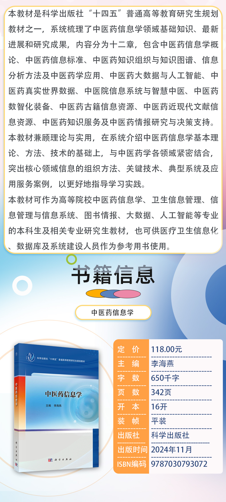 中医药信息学 十四五普通高等教育研究生规划教材 李海燕编 中医药系列适用于中医学中药学等以及从事医药相关研究的科研工作者等