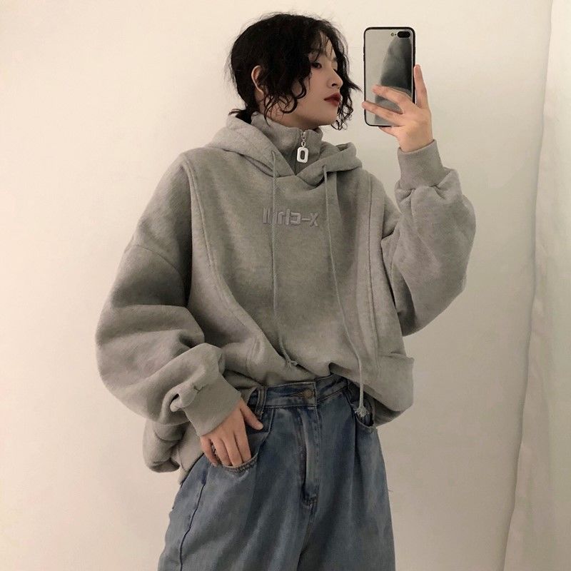 承包你整个秋衣的时髦~`宽松高领拉链原宿风连帽上衣ins加绒加厚学生卫衣女
