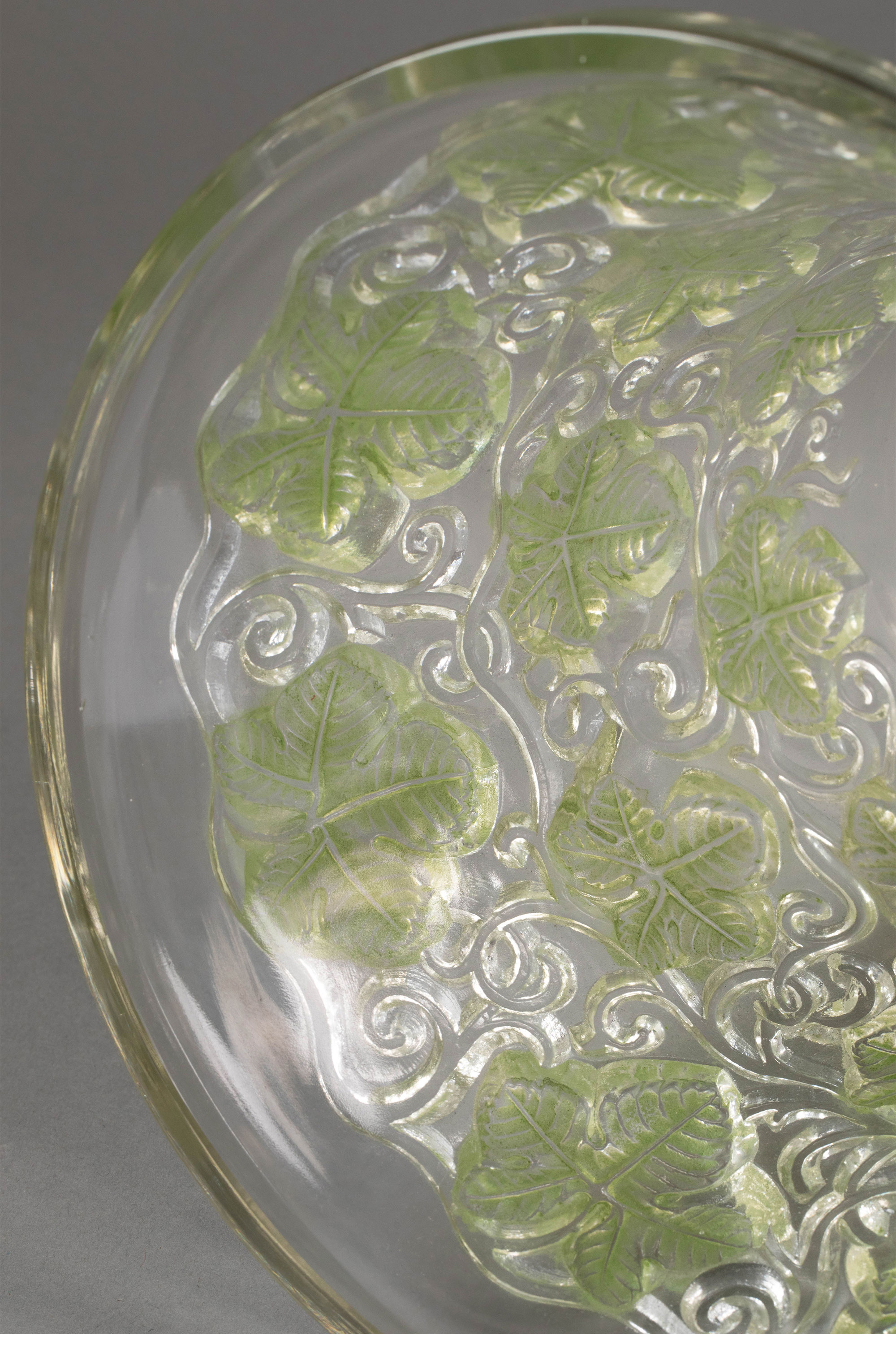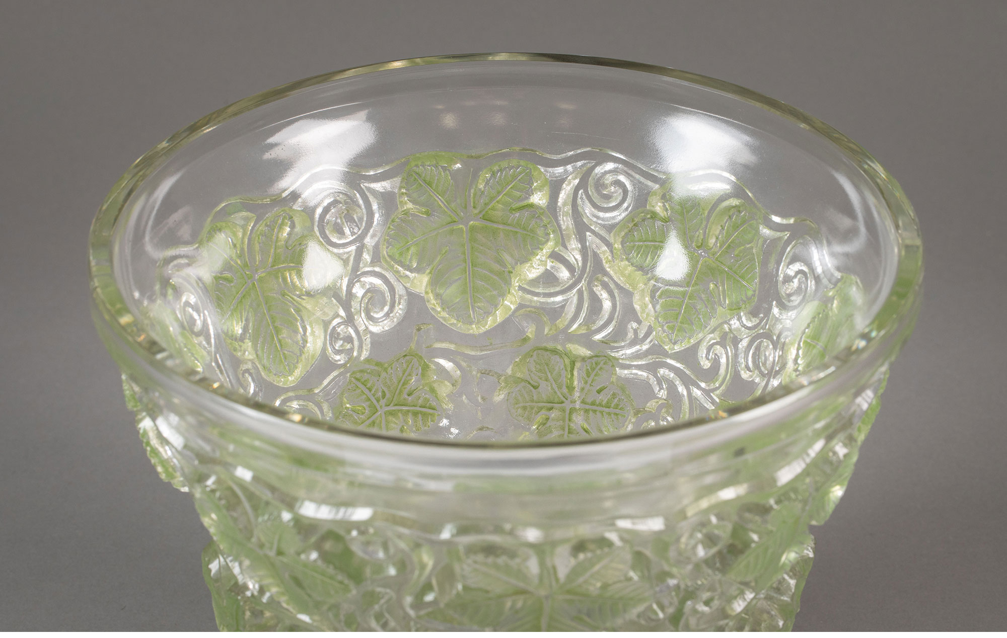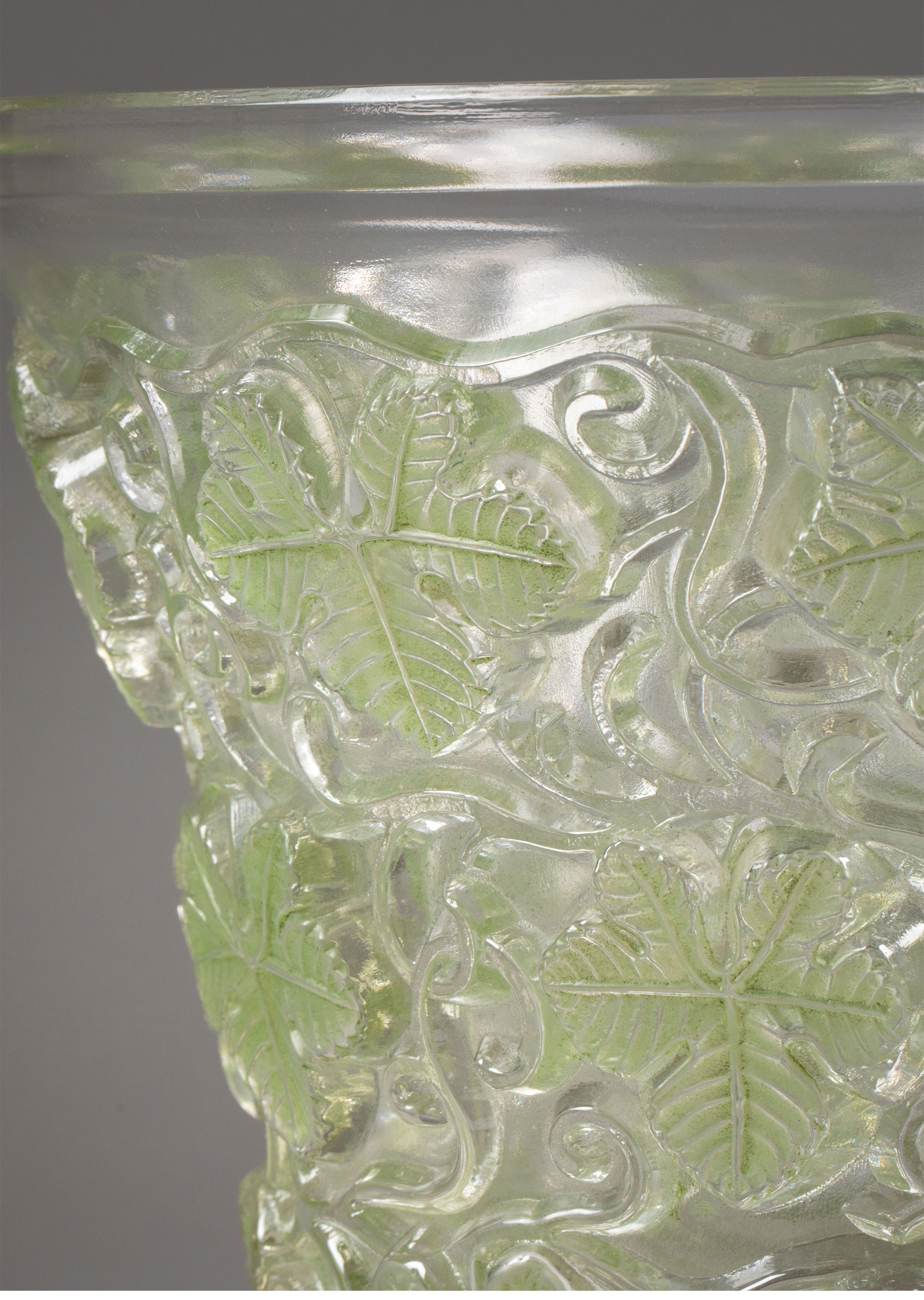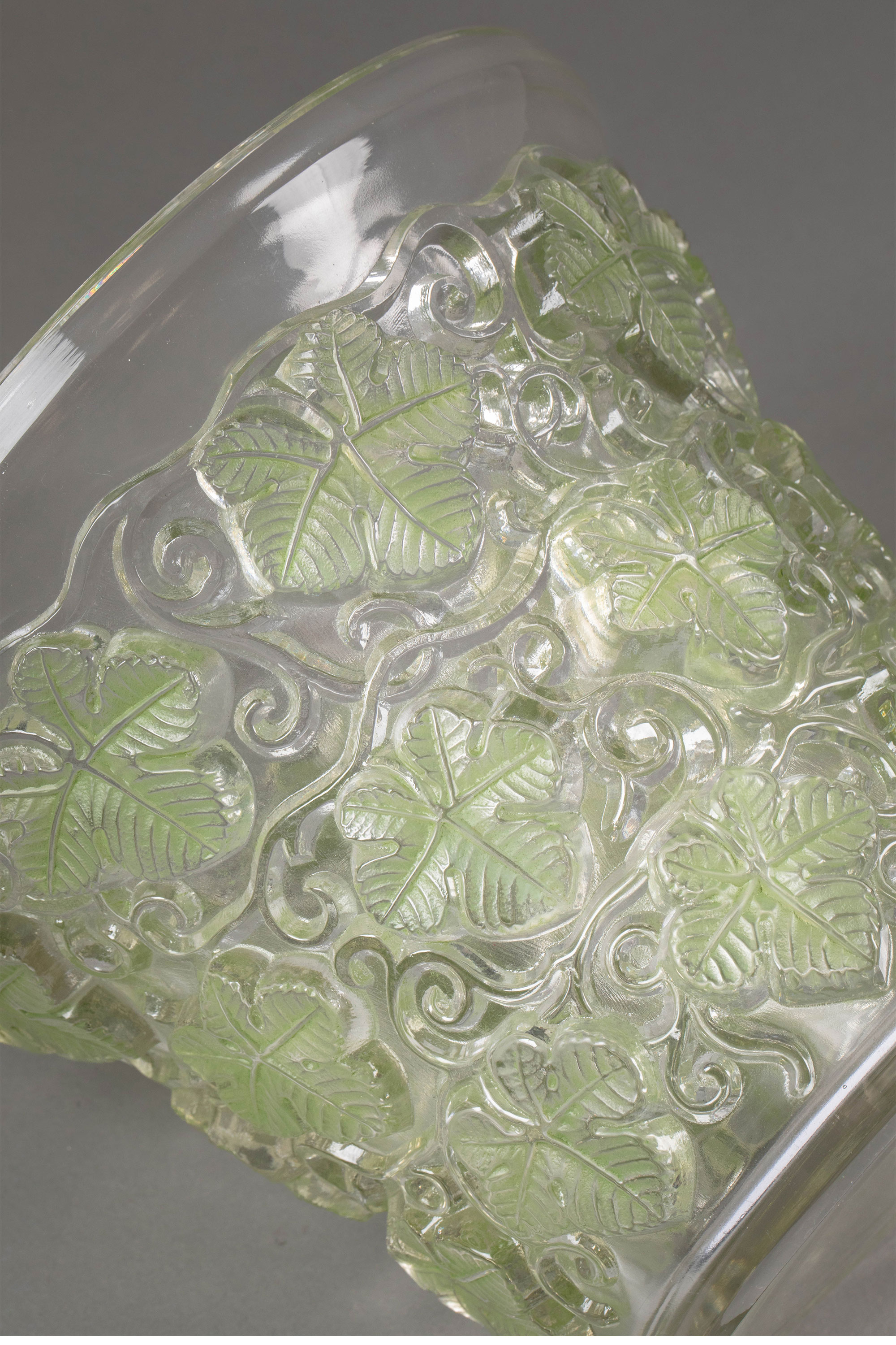 独角鹿西洋古董 1938年法国水晶工坊莱俪LALIQUE设计出品「Reims 葡萄藤叶」主题浅绿色水晶冰桶