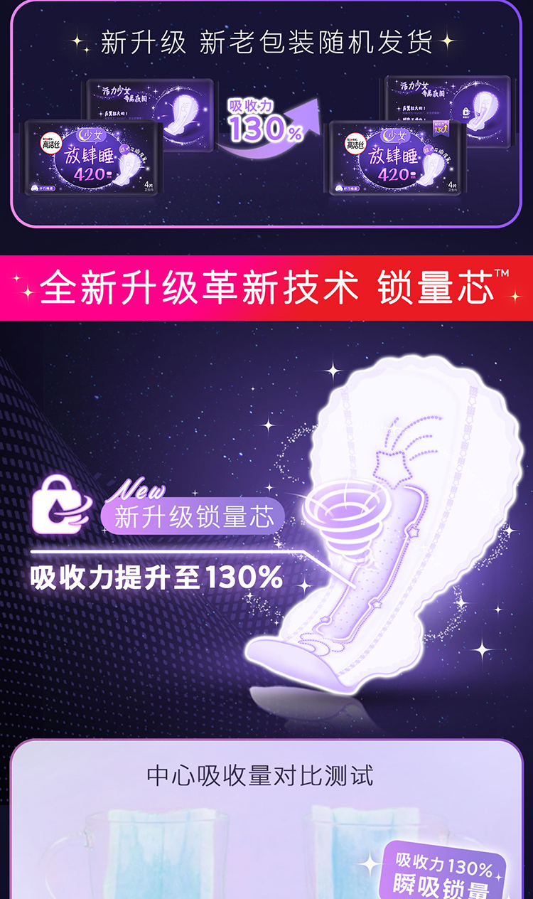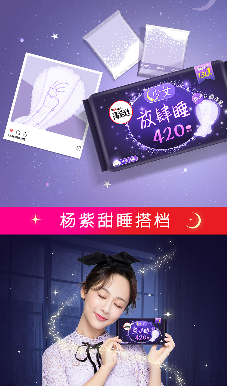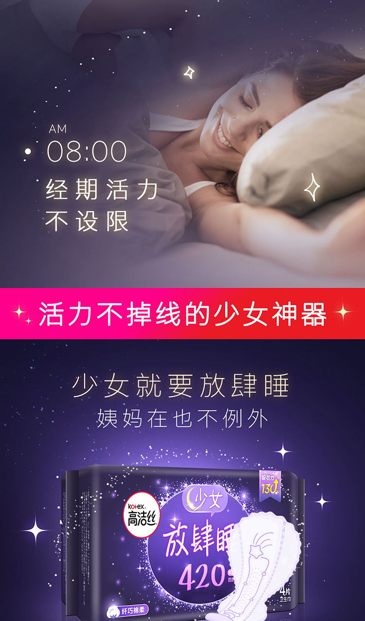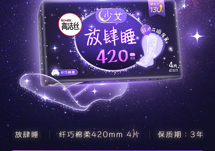 高洁丝Kotex放肆睡花瓣扇尾420mm4片超长夜用大扇尾锁量芯纤巧棉柔卫生巾(新老包装随机发货)