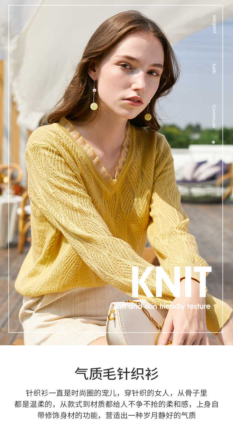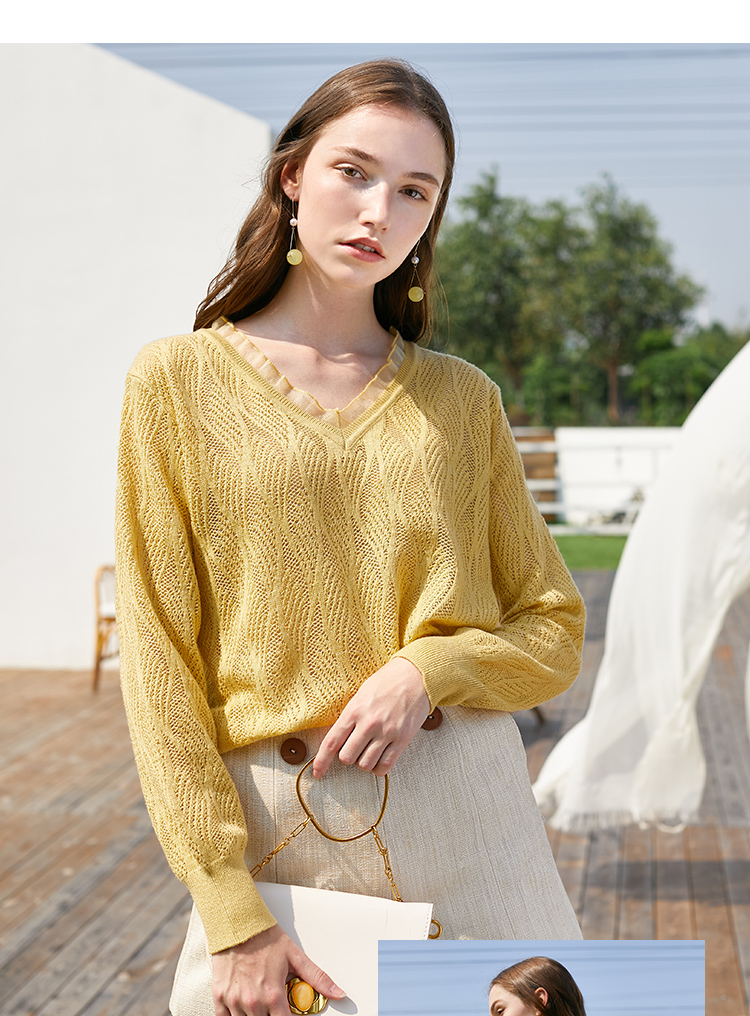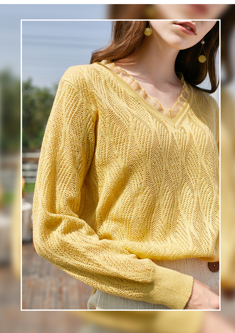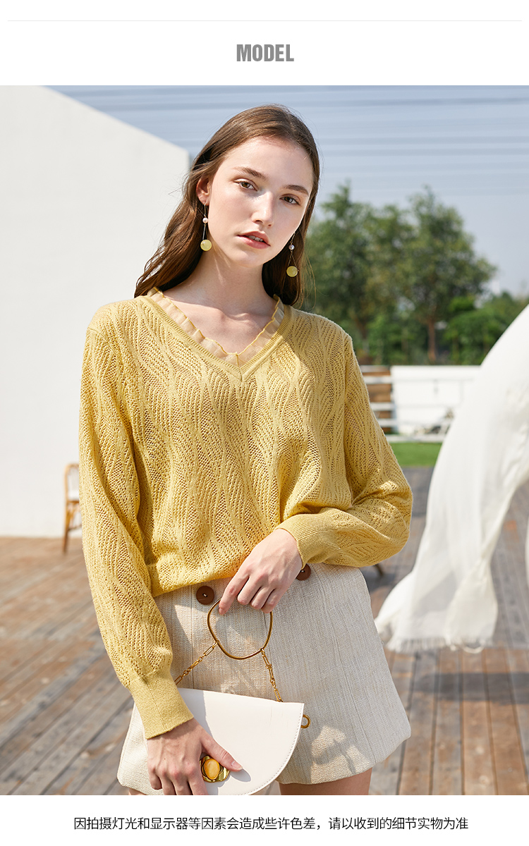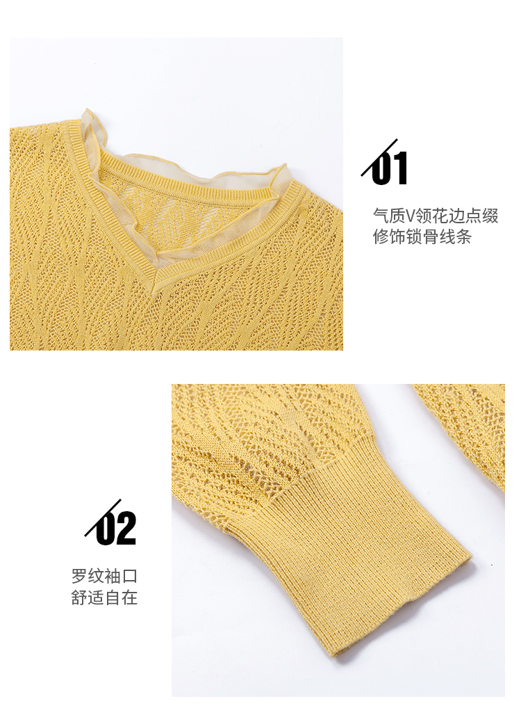 欧芮儿2022春装新款长袖V领针织打底衫女镂空宽松显瘦套头毛衣