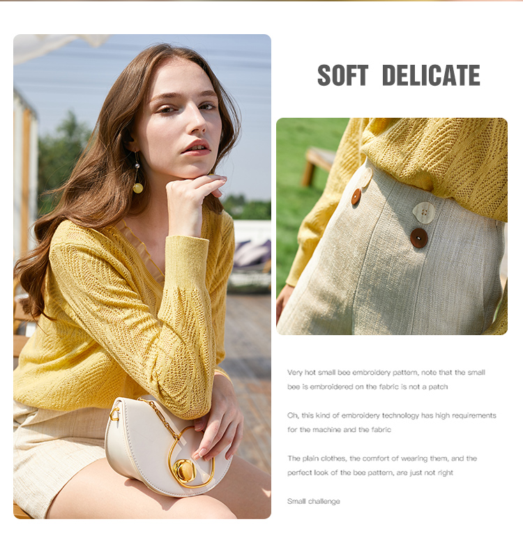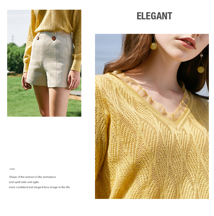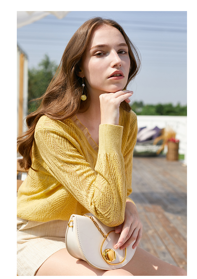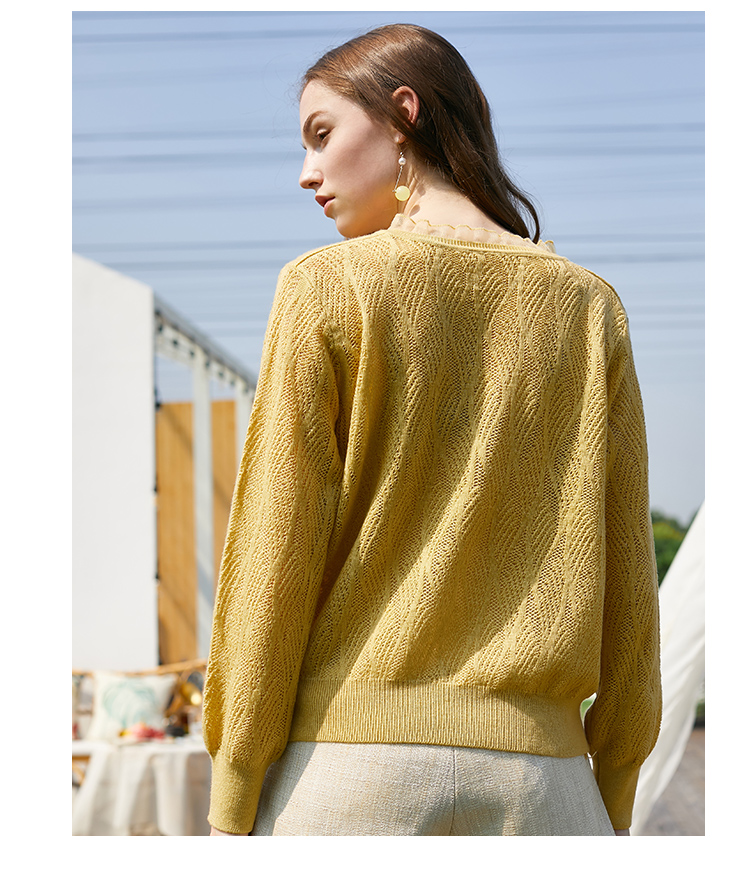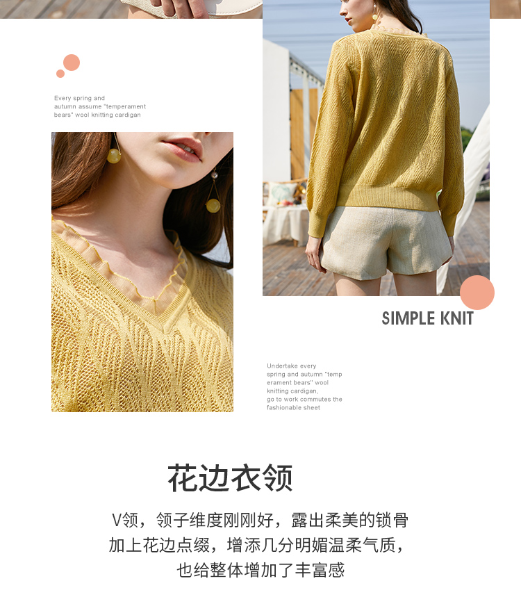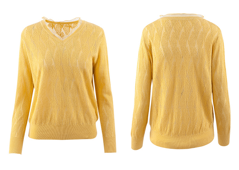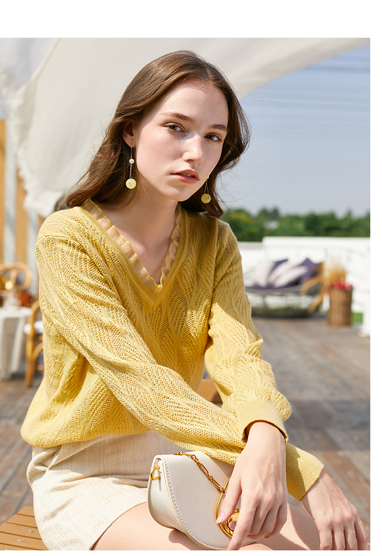 欧芮儿2022春装新款长袖V领针织打底衫女镂空宽松显瘦套头毛衣