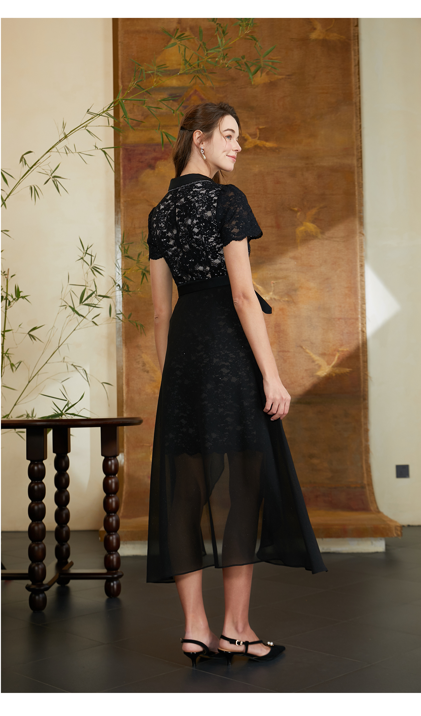司歌蕾丝两件套收腰连衣裙拼雪纺T0911027X