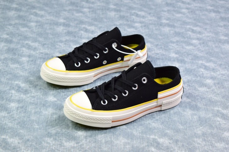 Converse 最新结构系列! 匡威 Chuck 70时尚拼接撞色黑色帮鞋面+黄色底+白色围条附着棕色和黄色的水线 尺码:35-44