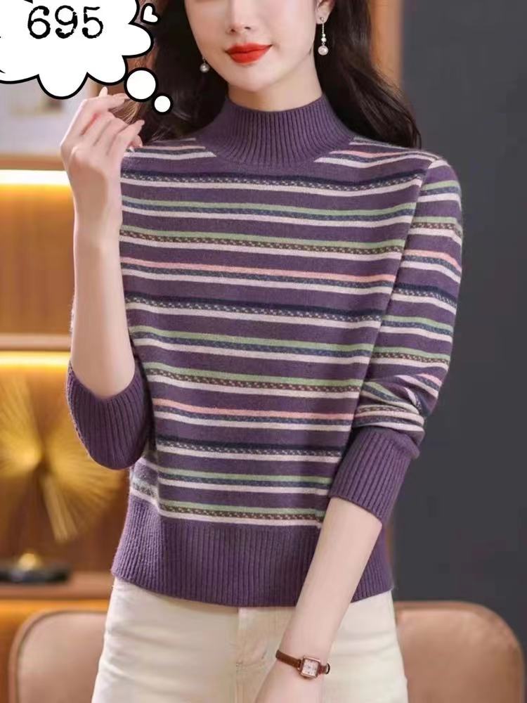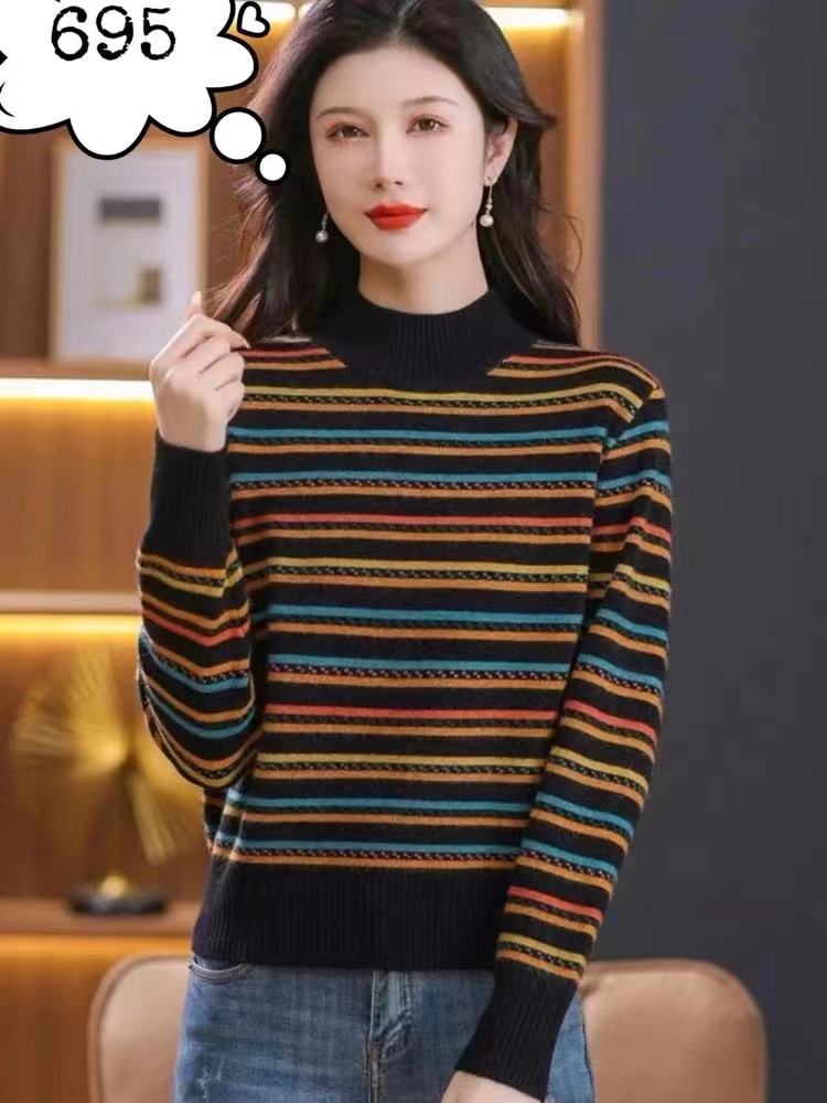 彩条纹毛衣女秋冬新款加厚宽松内搭半高领羊绒打底衫