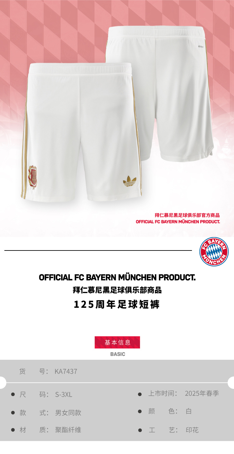 【官网同款】拜仁慕尼黑足球俱乐部 | 125周年足球训练男士休闲短裤球迷