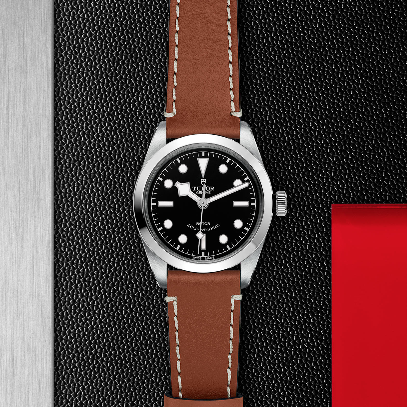 不锈钢旋入式上链表冠,饰以浮雕帝舵表玫瑰标志,配黑色阳极氧化铝上链表冠轴