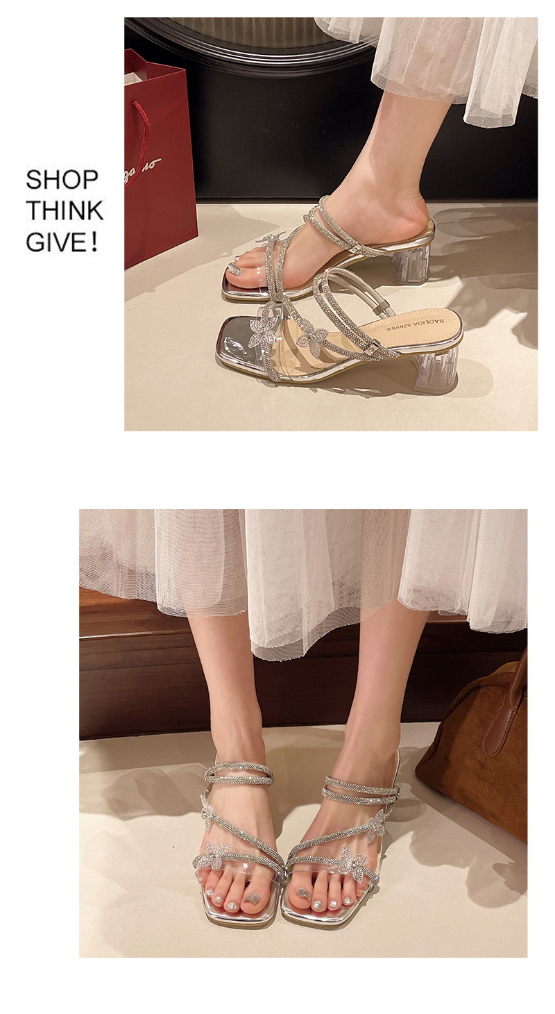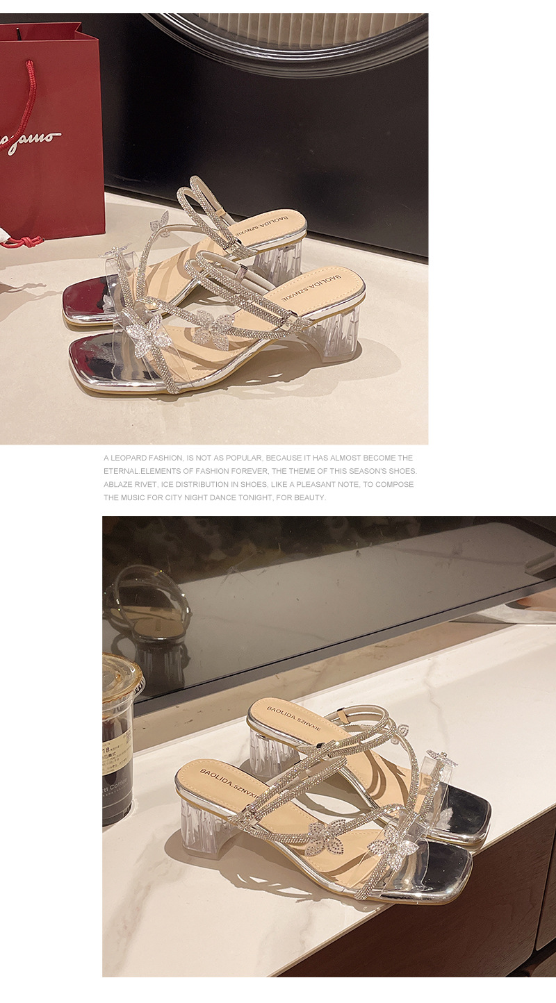 【可甜可酷! 日常通勤】法式蝴蝶结水钻女显白夏新款爆款绝美配裙子粗跟水晶跟凉拖鞋。ry