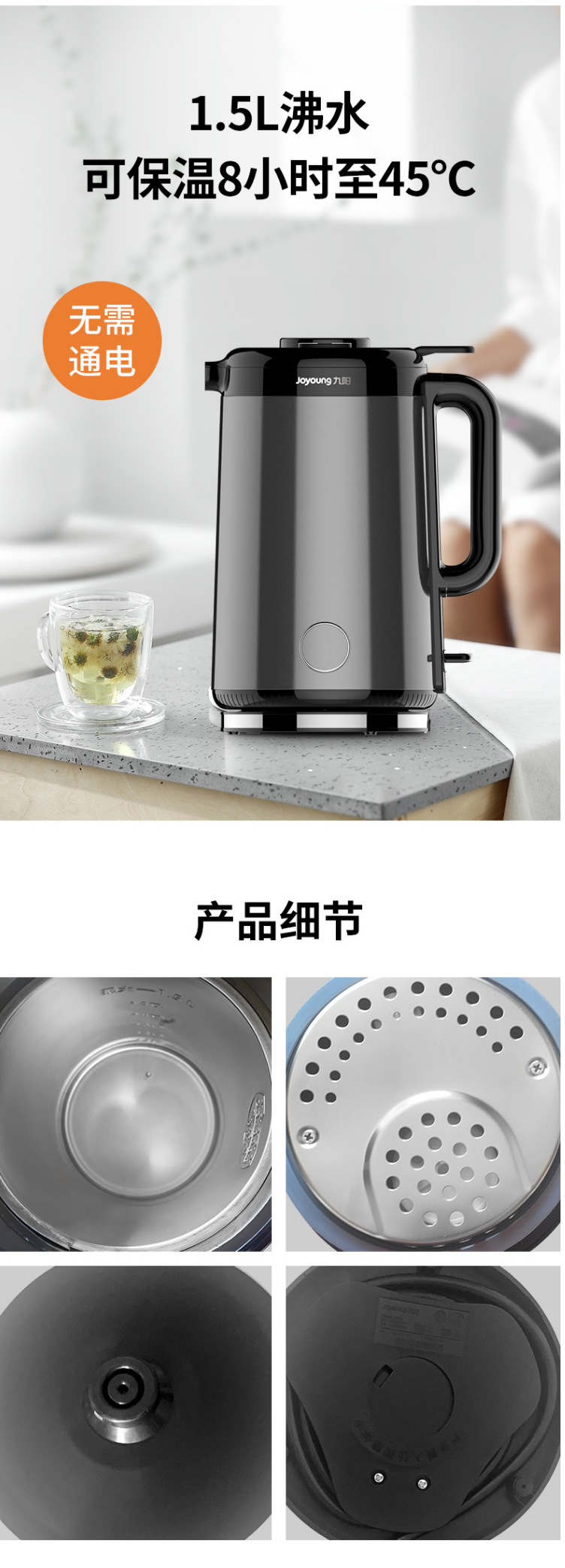 九阳(509685)(Joyoung)电热水壶家用厨房低音烧水壶自智能动断电保温双钢杯1.5L K15FD-W970