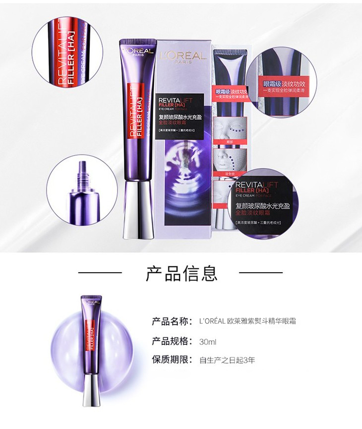 【一般贸易】法国巴黎欧莱雅复颜玻尿酸水光充盈眼霜30ml+晶露65ml+乳液50ml女士护肤品套装