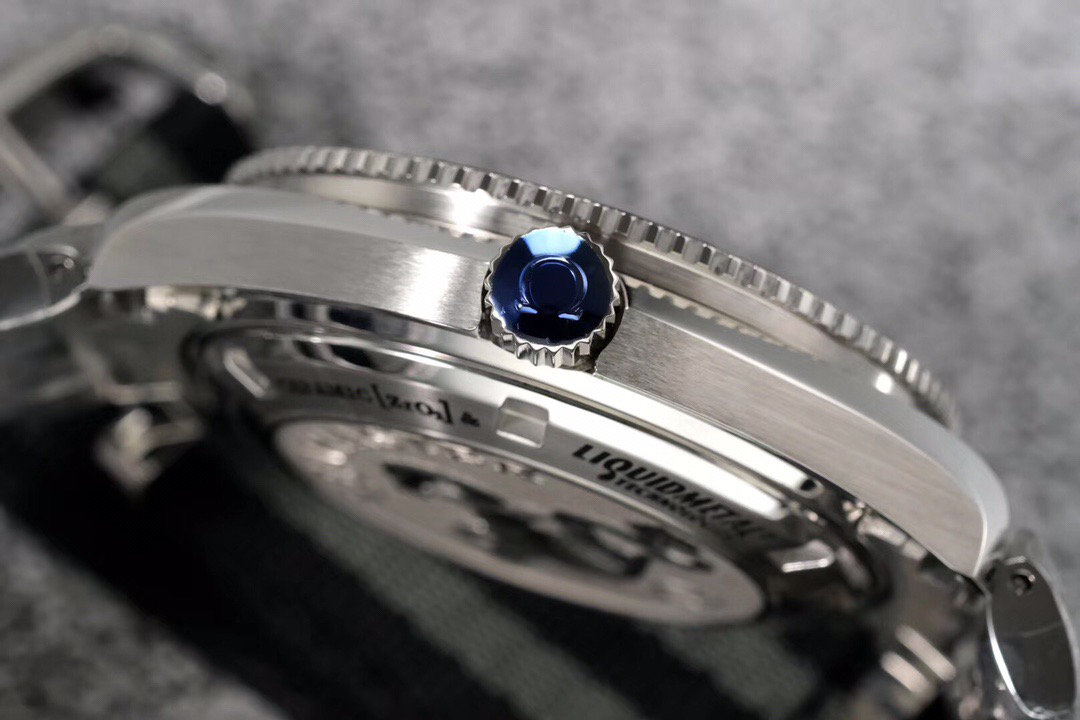 左侧和把头一样的装置是排氦阀门,为深潜所用(潜水上百米那种),可以调节表内外气压,使它不至于气压过大被破杯。相信普通人很难用到。所以复刻只是做到了样子,并没有还原其功能。蓝色为贴膜,实际为钢色。