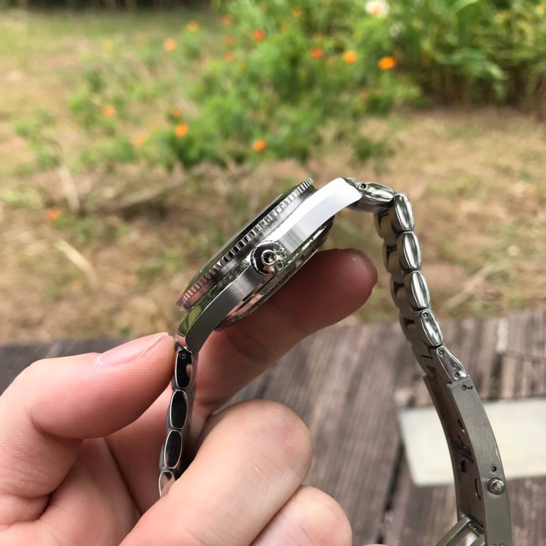 V1-V3版还有夜光刻度填充的溢出问题,蓝宝石镜面外层镀膜容易磨花的问题,让表友们又爱又恨,后来经历了V2版、V3版的升级,V3版改进了夜光填充,已经相比前两版好了许多,但仍有一点控制力不是的感觉,略微不均匀的情况。这次的V4版本时标刻度夜光填充塔称完美,毫无溢出并且非常均匀,夜光的颜色稍稍更绿了一点,更接近正品。现在是v5版本了,已经可以达到"双免傍地走,安能辨我是雄雌"