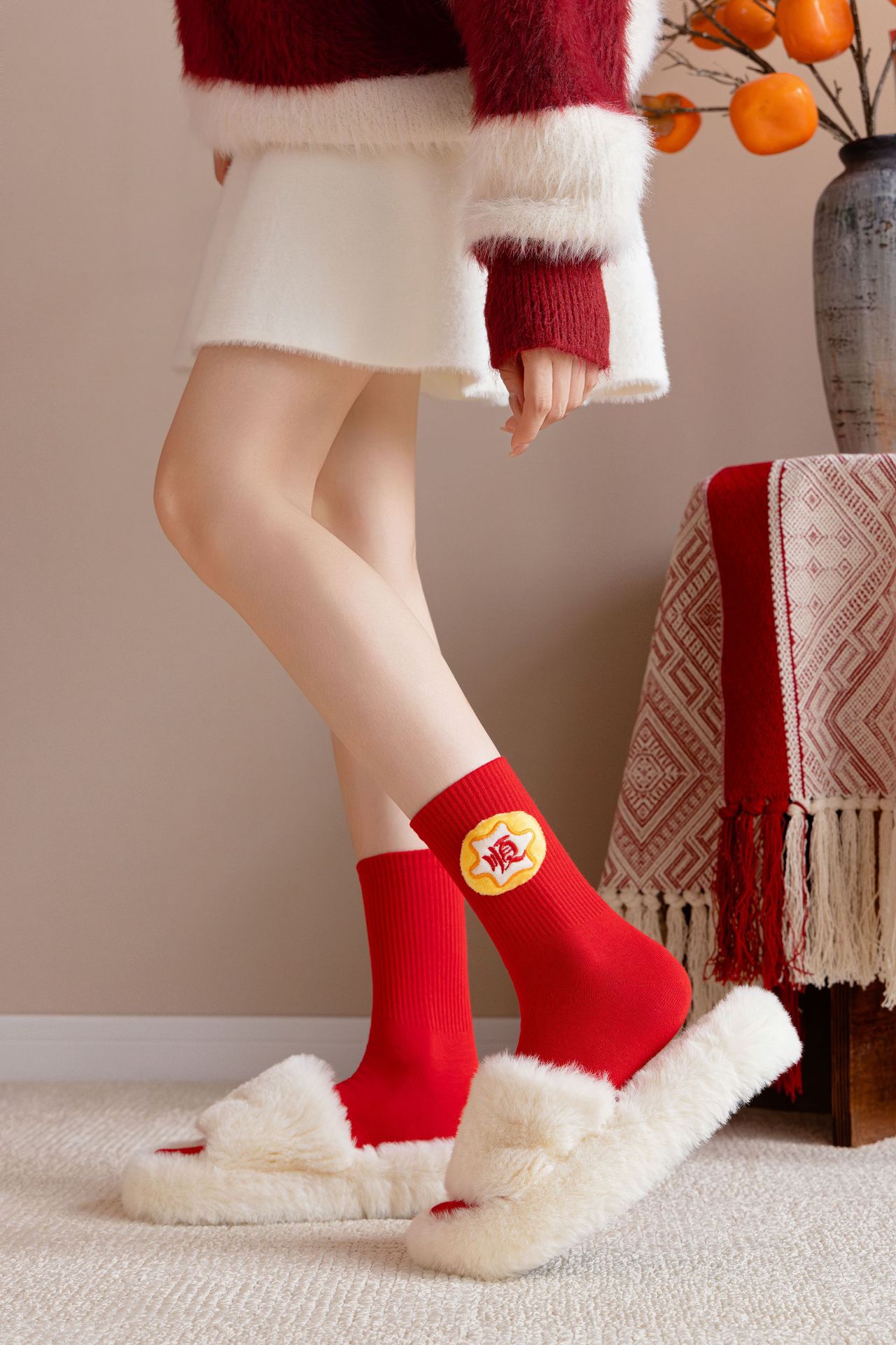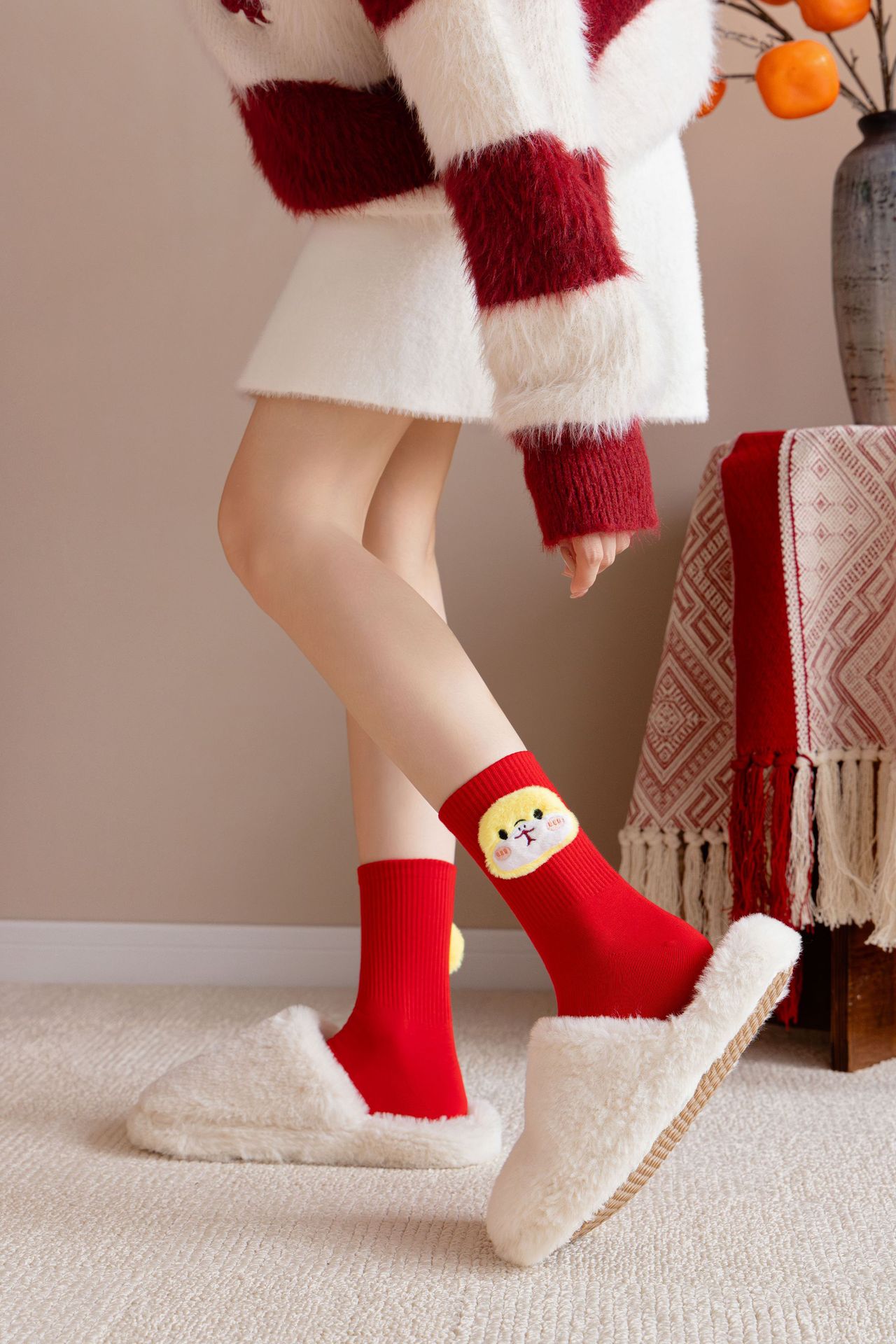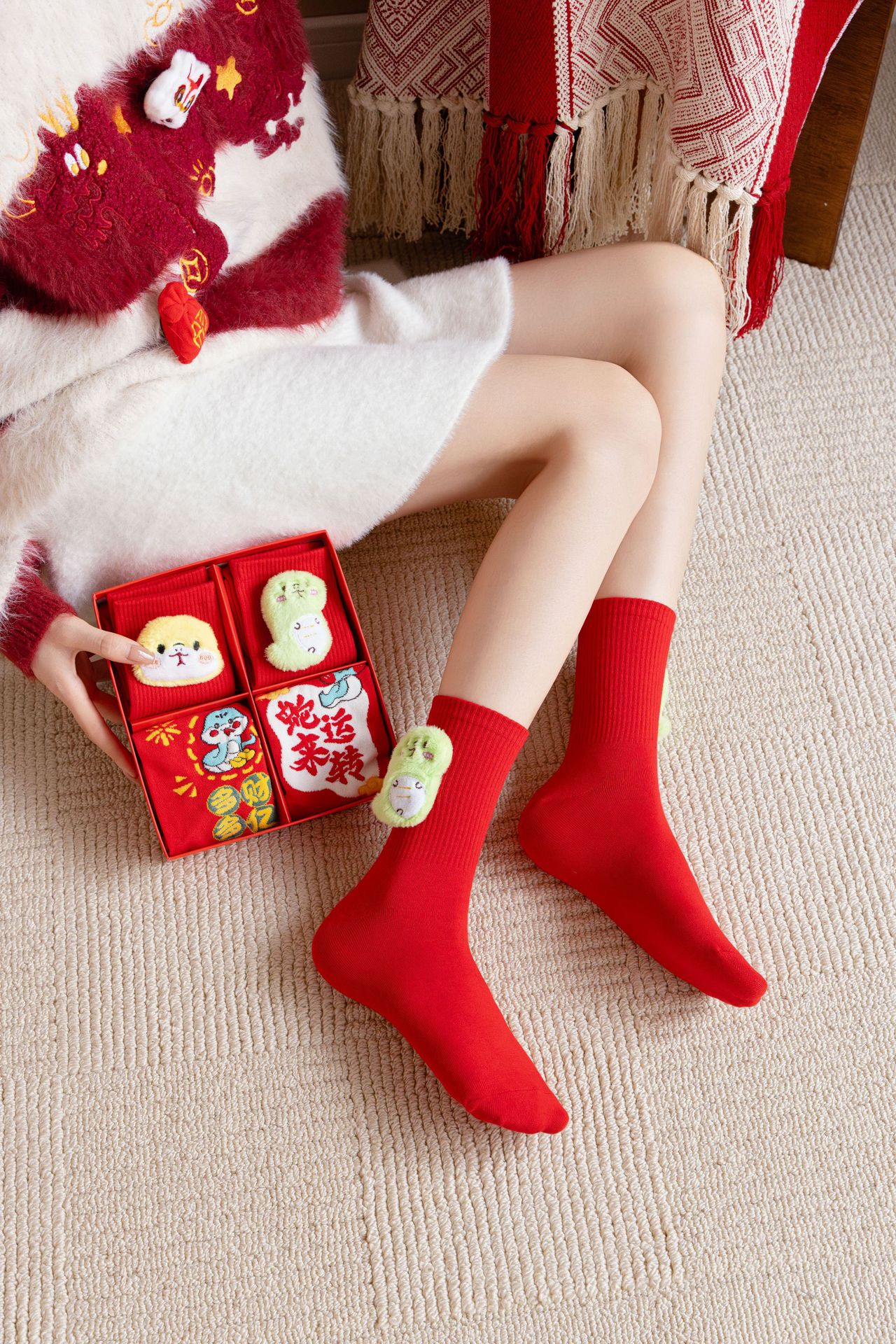 【赠手提袋】新年红袜子本命年大红色新年袜礼盒装 男女吸汗中筒棉袜卡通礼品 蛇年本命袜4双装
