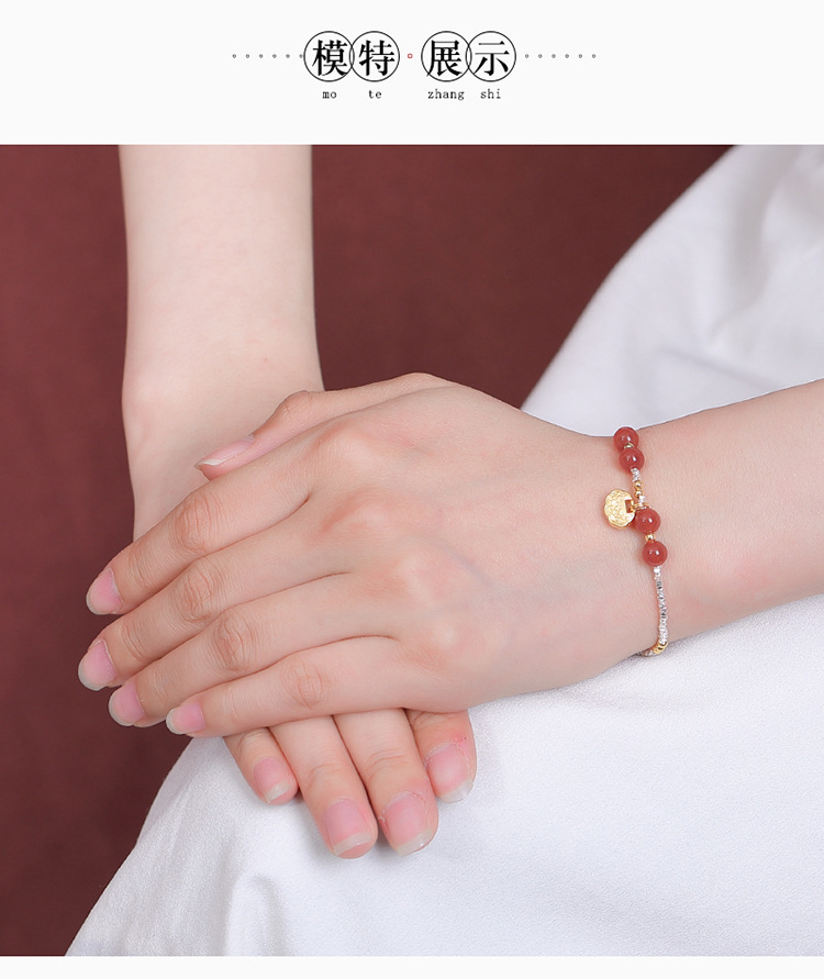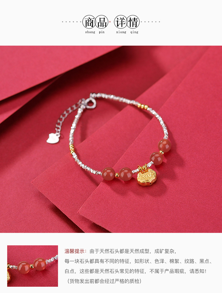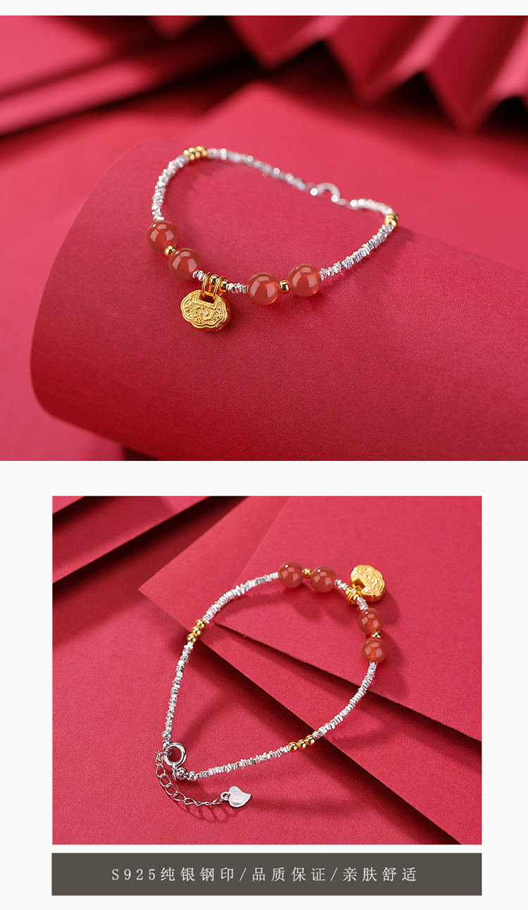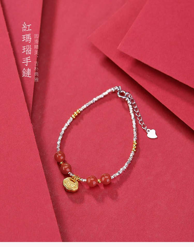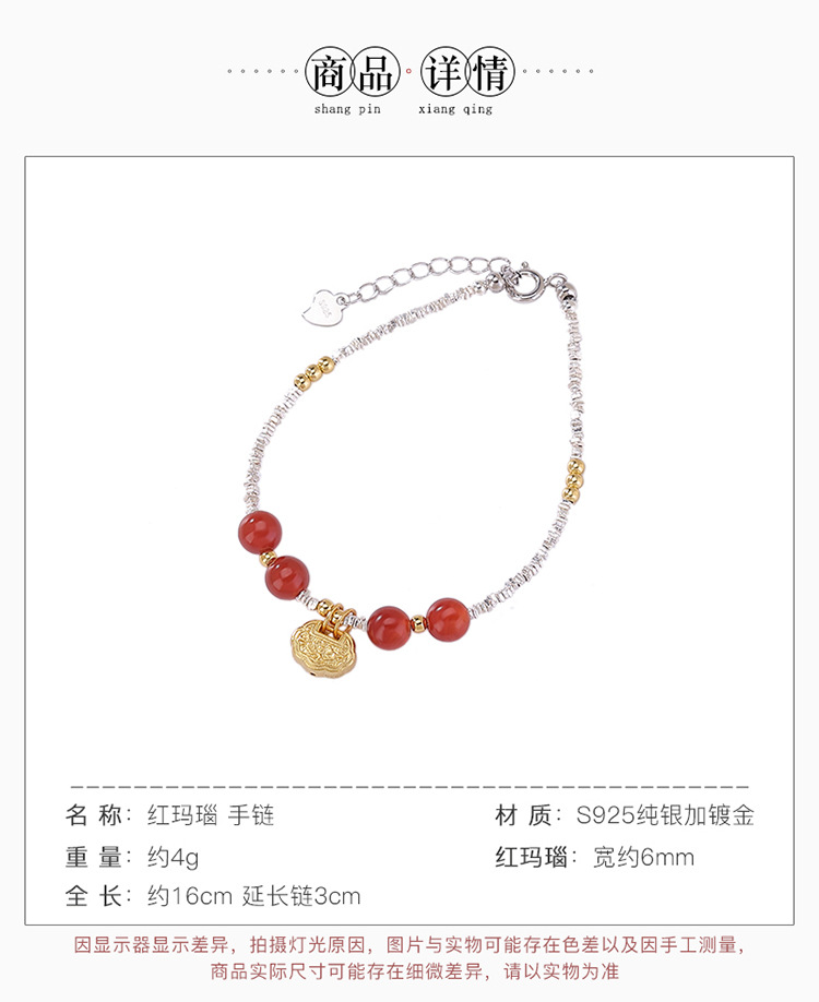 【长命富贵】S925银镀金红玛瑙圆珠分色碎银长命锁牌手链【CW-SL11735-5】