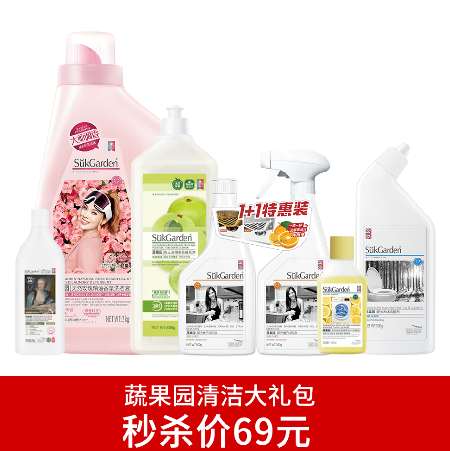 (送手提礼袋)谷爱凌同款蔬果园清洁大礼包含4斤玫瑰精油香氛洗衣液*1+油污净500g*2+青玉油杆800g餐具净*1+500g松木洁厕*1+250ml洗衣机清洁剂*1+200g青蒿除菌内衣裤洗衣液*1