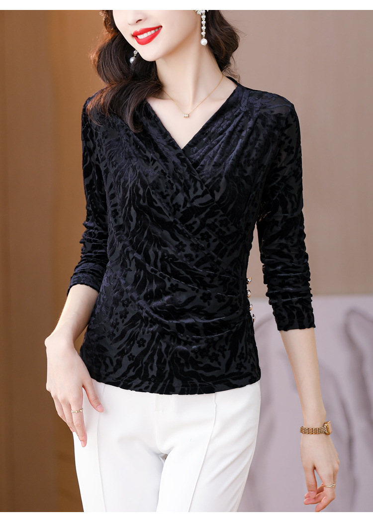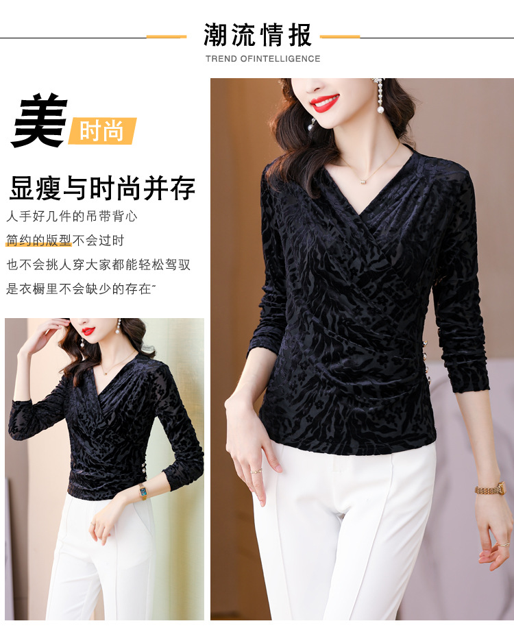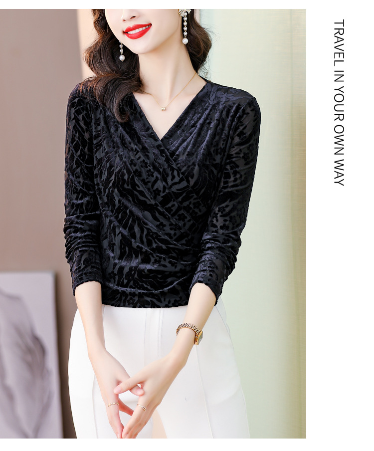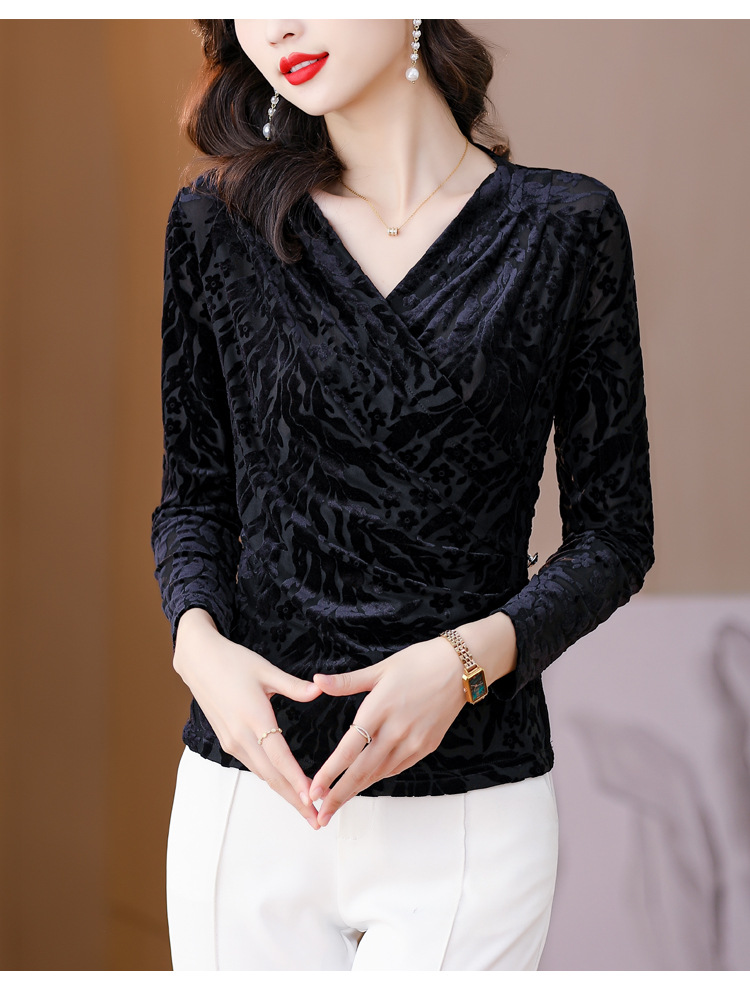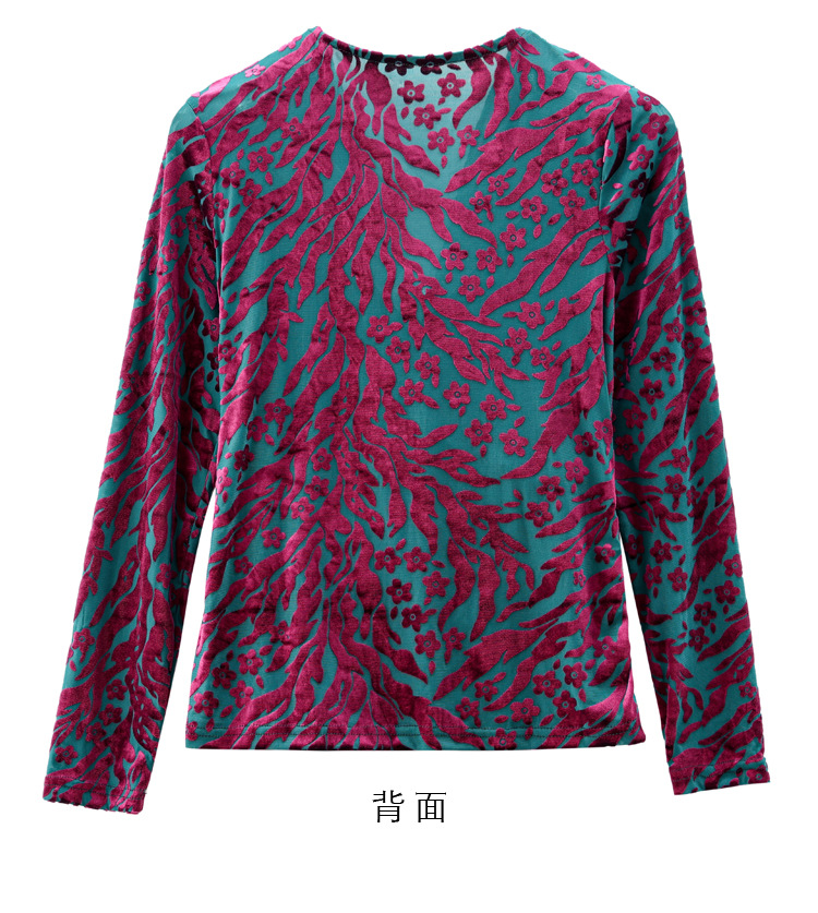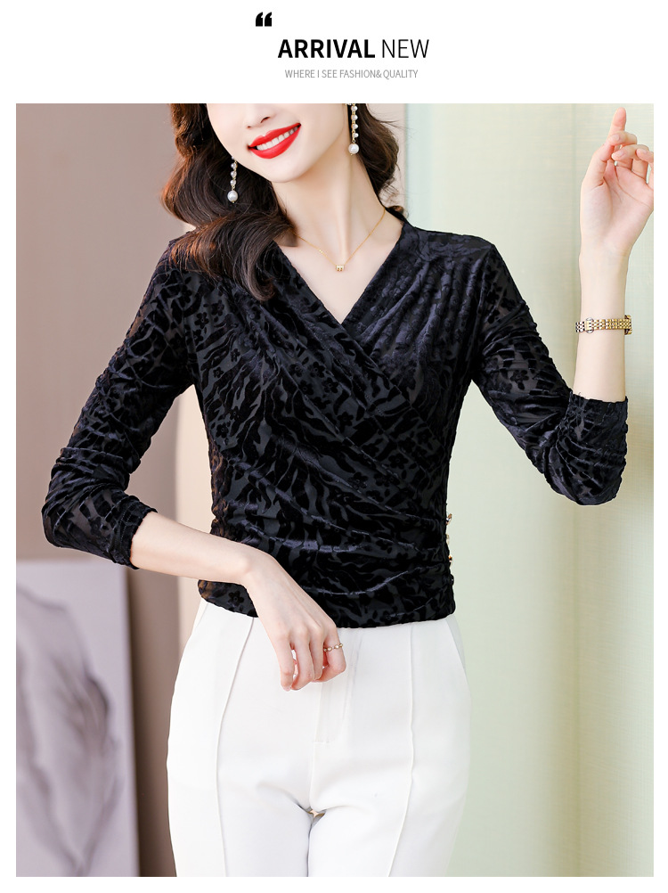 气质妈妈装V领网纱植绒长袖小衫,秋季新款百搭弹力显瘦上衣KQL-3962