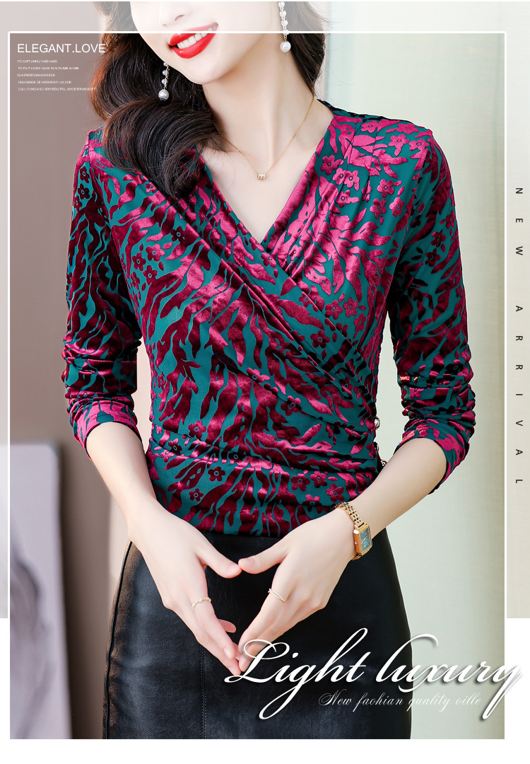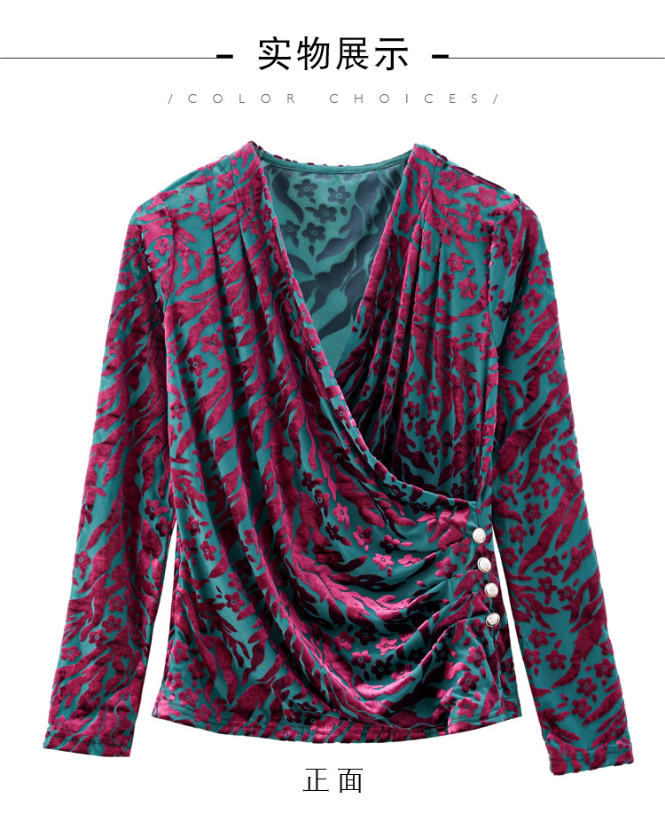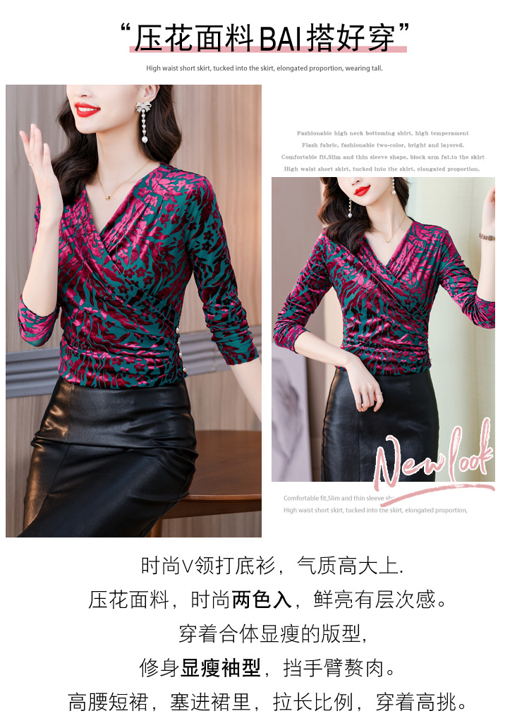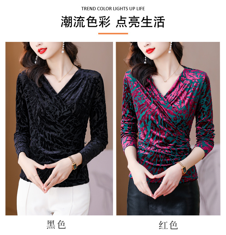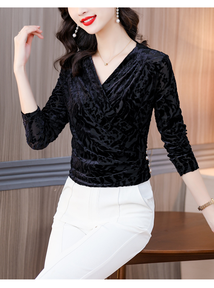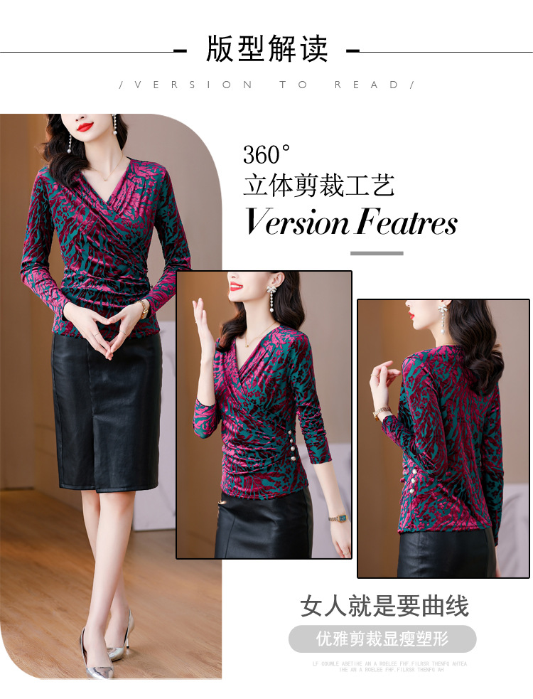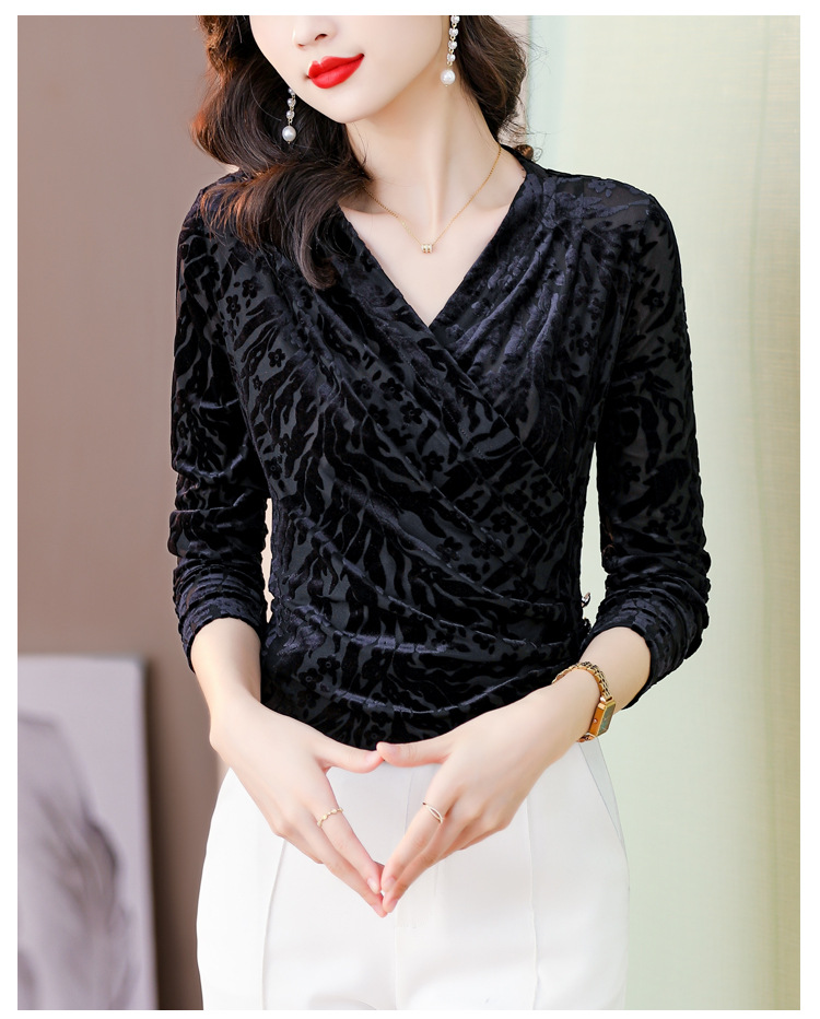 气质妈妈装V领网纱植绒长袖小衫,秋季新款百搭弹力显瘦上衣KQL-3962