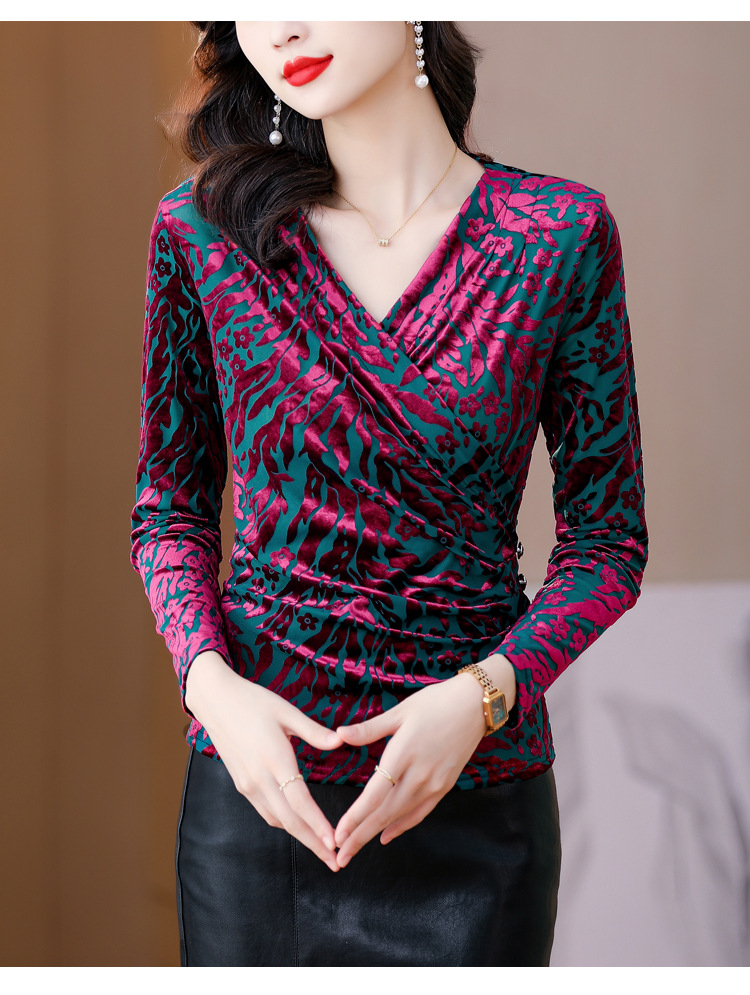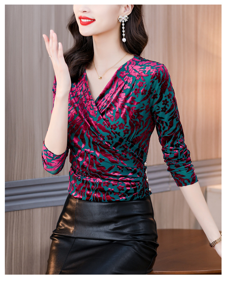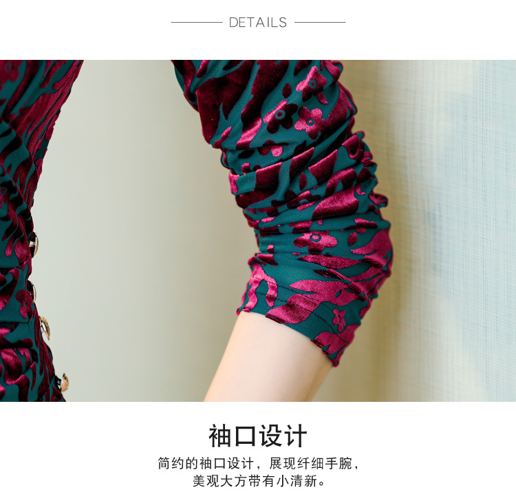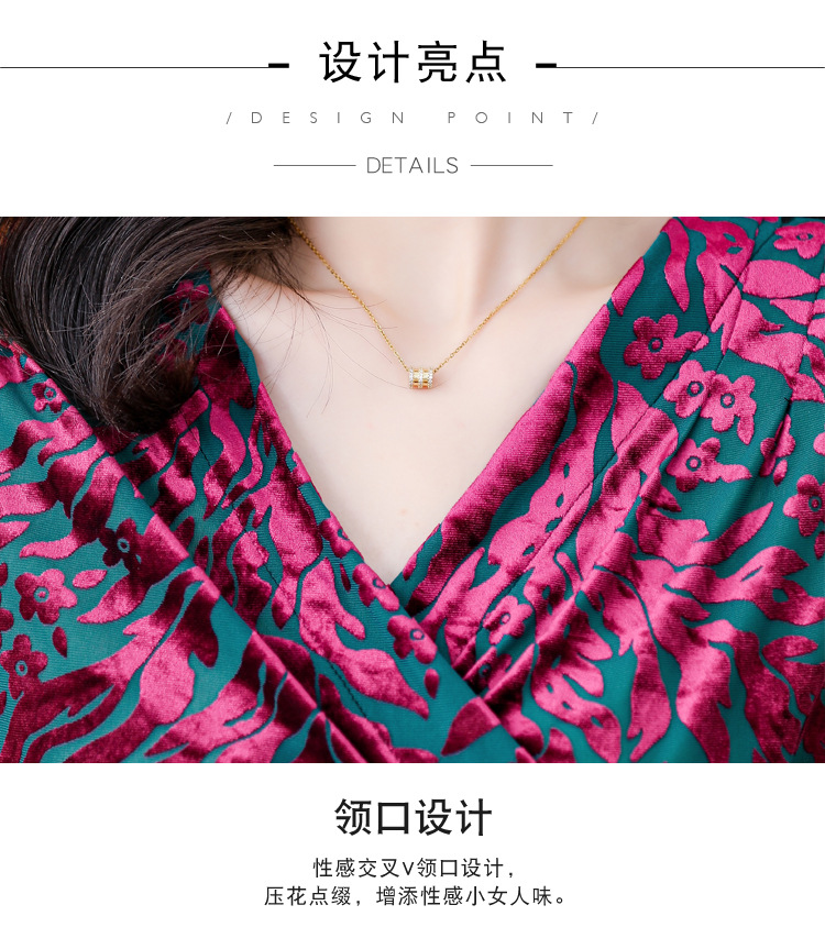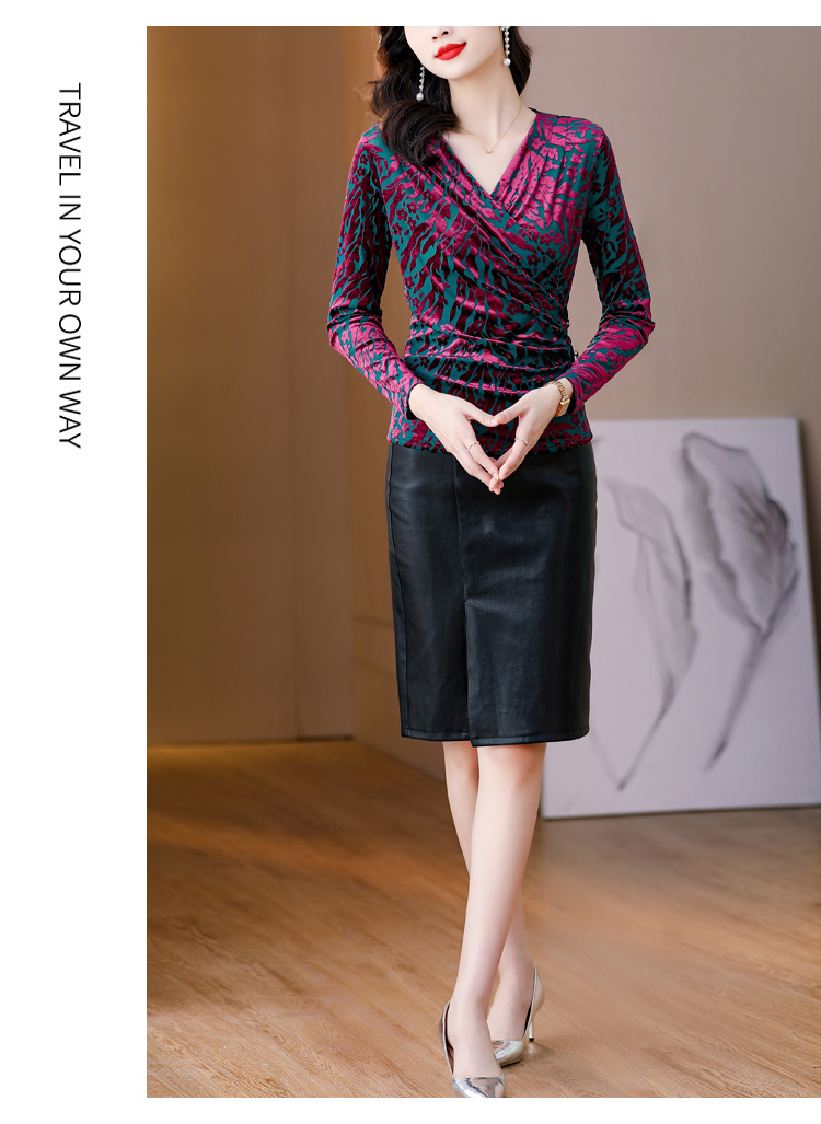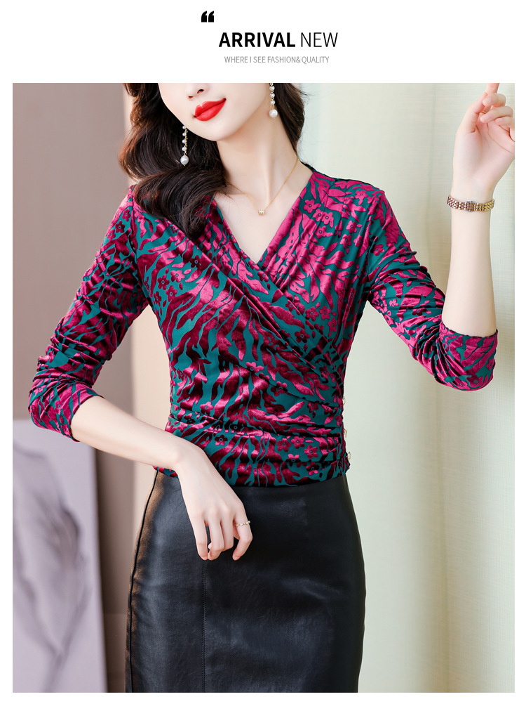 气质妈妈装V领网纱植绒长袖小衫,秋季新款百搭弹力显瘦上衣KQL-3962