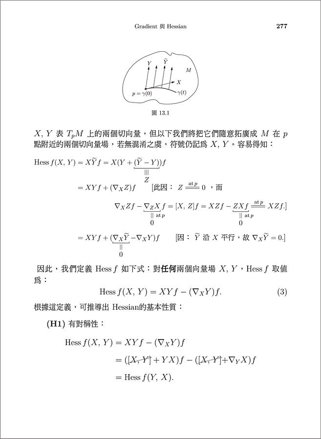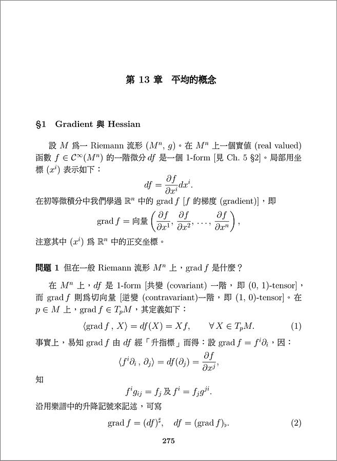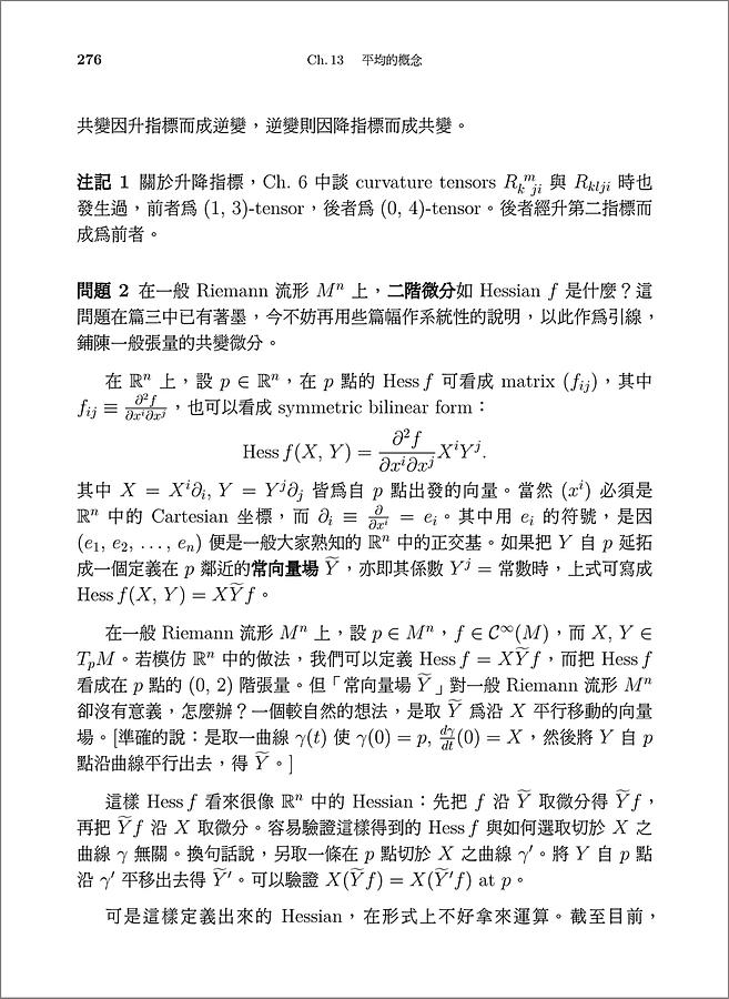 這套書三卷分別是「Riemann幾何基礎」、「活動標架法」(moving frames)及「幾何變分學」,涵蓋九大篇,共三十章,並於上卷與下卷加入〈前篇〉及〈衍篇〉各三章,以作為微分幾何「基礎入門」與「延伸進階學習」之用。