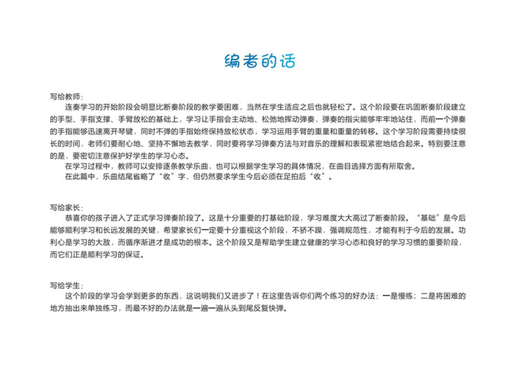 《新编儿童钢琴初步教程》是一套为广大琴童设计的循序渐进地学习钢琴的教程,只要小朋友们在老师的指导下一步一步地踏实地跟随教程的安排学习,就一定能够获不断地在钢琴弹奏方面稳步成长。