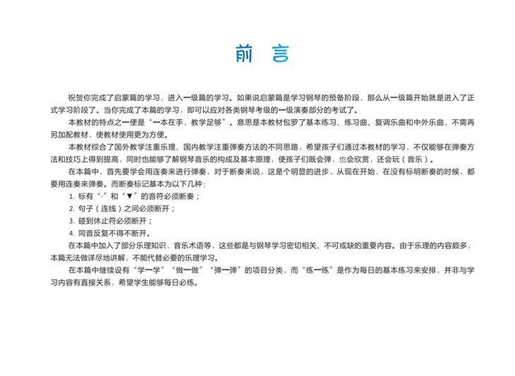 这套教材的特点,是综合了学习进程中所需要的各种要素,它包括了基本练习,有音阶、和弦、琶音,和各种手指练习;包括了练习手指技巧的乐曲;包括了学习复调的乐曲;还包括了具有音乐表现力的乐曲,同时还选用了多首大家喜爱的较流行的改编曲,特别还选用了中国音乐的乐曲。它还包括介绍了乐理知识,丰富了小朋友在学习过程中容易忽略的内容。