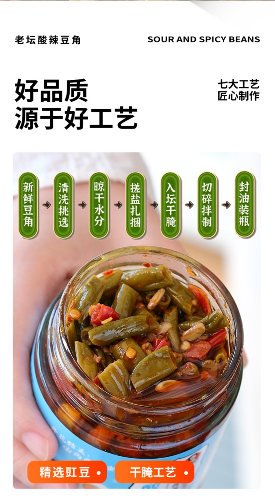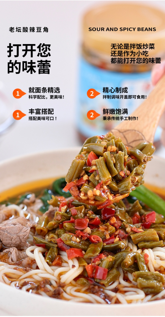 瓶即食,瓶装也好存放,方便携带 厨房里的“万能配角”,餐桌上的“灵魂主角”! 不起眼的小酸豆角,却是无数家常菜的“点睛之笔”。 酸香脆嫩,一勺就能让整盘菜活色生香!