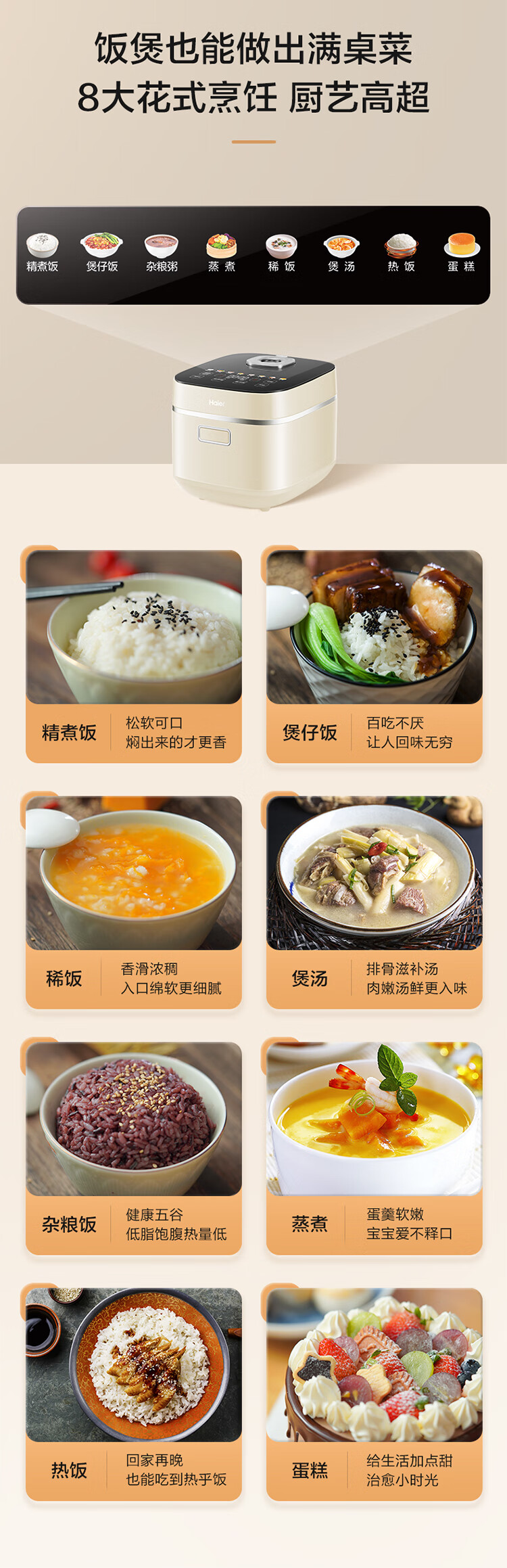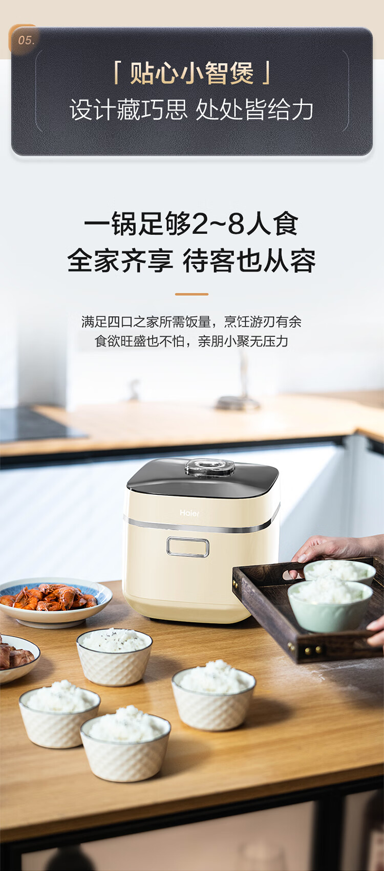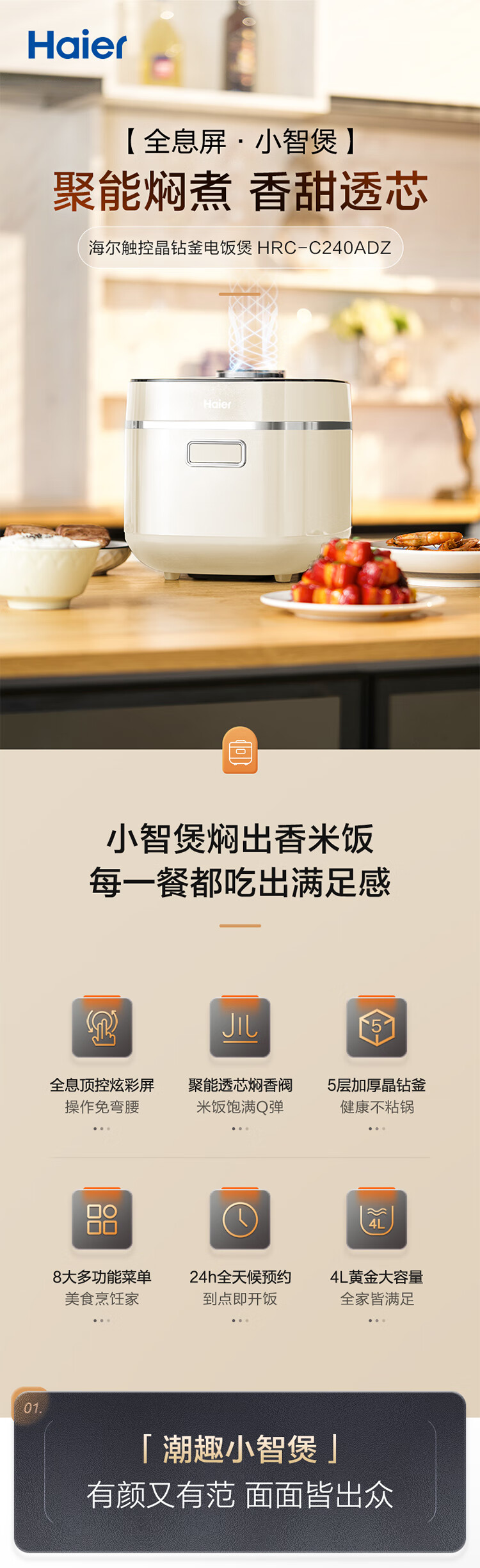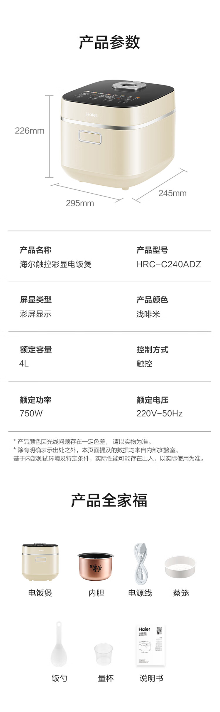 海尔(Haier)电饭煲电饭锅4L晶钻厚釜内胆全息触控屏3-8人多功能家用智能电饭煲HRC-C240ADZ 浅啡米