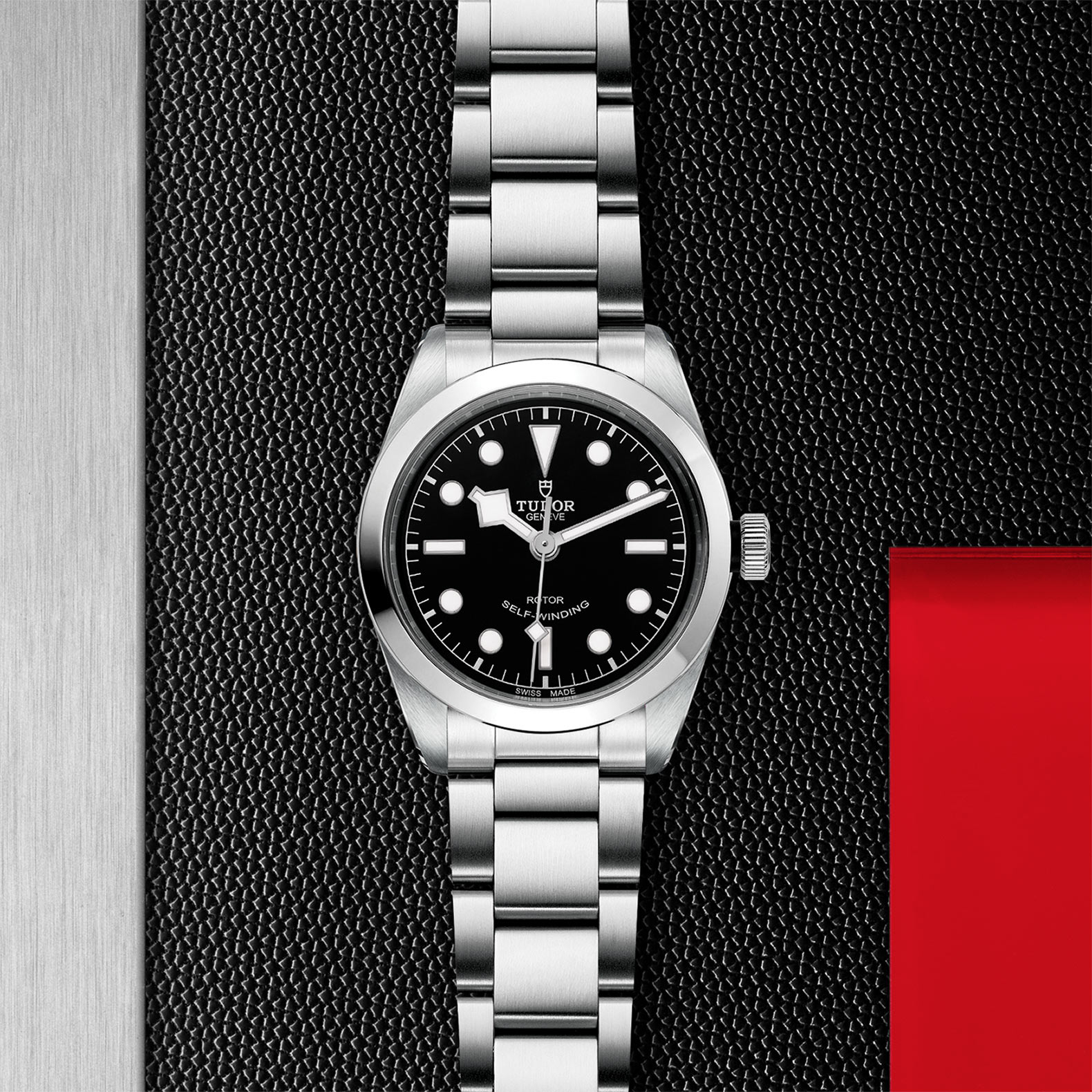 不锈钢旋入式上链表冠,饰以浮雕帝舵表玫瑰标志,配黑色阳极氧化铝上链表冠轴