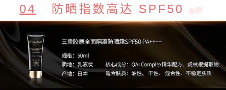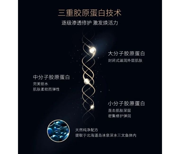 QAI是一种复fang成分,其中的亮点是从北海道天ran冰泉的深水鲑鱼中提取出的3种不同大小的天ran胶原蛋白,不仅可以修护被阳光损伤的肌肤、还能增强皮肤抗晒能力,同时拥有镇定肌肤,深ceng补水的能力,即使在敏gan的肌肤都能放心使用。