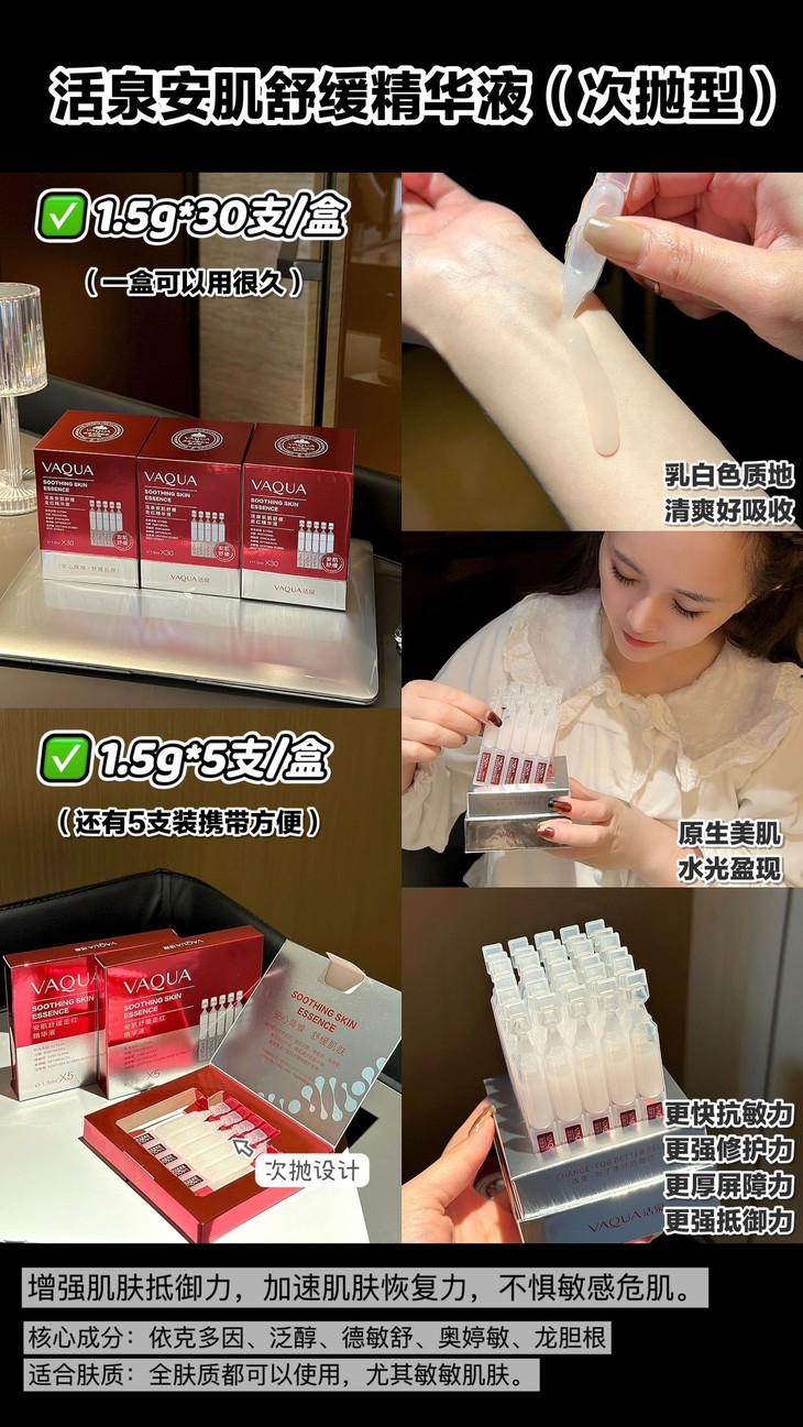 :精美活泉品牌盒装 :1.5g*30支/盒 深层滋养肌肤,改善肌肤弹性和紧致度 对受损皮肤有强大的修护力 所以敏感肌也可以放心使用哦~ 每天使用即可看到明显的效果 次抛设计!干净卫生!强烈安利给姐妹们👭