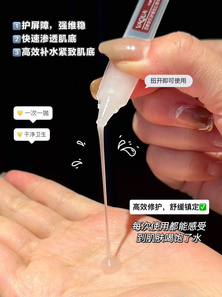 次抛设计,独立包装,用起来干净又卫生 有效保证产品成分的活性,不会撒漏 小细节的设计也很戳我的审美! 能够很好的给肌肤补水修复,防止起皮 具有紧致、抗氧、舒缓、润护的多重作用