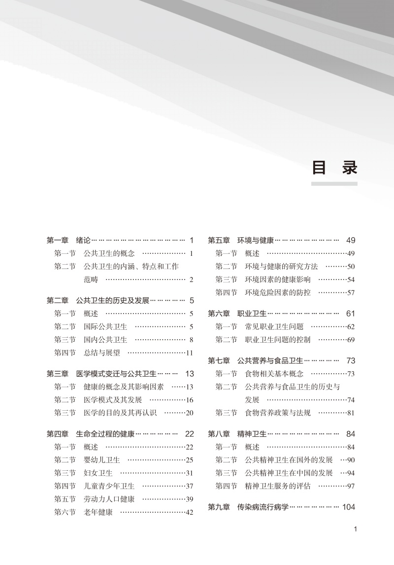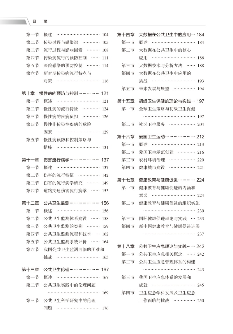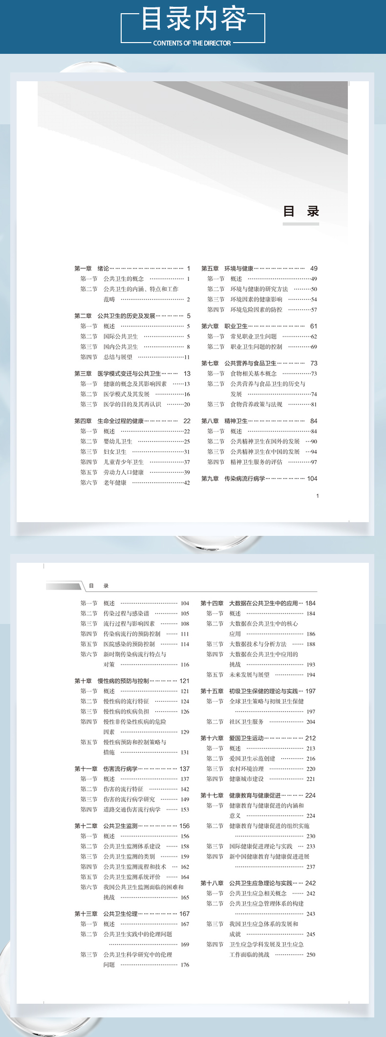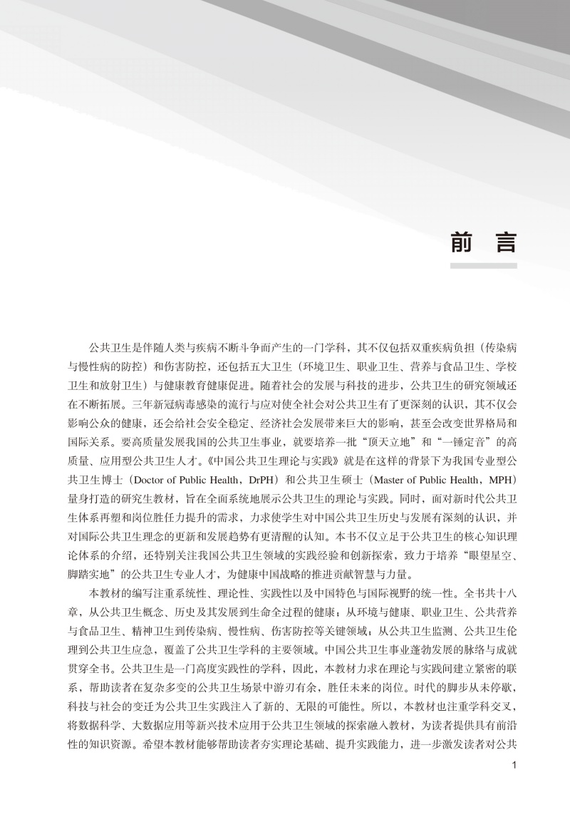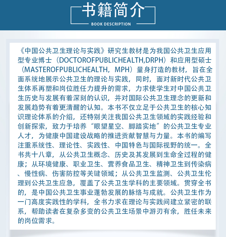 《中国公共卫生理论与实践》研究生教材是为我国公共卫生应用型专业博士(DoctorofPublicHealth,DrPH)和应用型硕士(MasterofPublicHealth,MPH)量身打造的教材,旨在全面系统地展示公共卫生的理论与实践,同时,面对新时代公共卫生体系再塑和岗位胜任力提升的需求,力求使学生对中国公共卫生历史与发展有着深刻的认识,并对国际公共卫生理念的更新和发展趋势有着更清醒的认知。本书不仅立足于公共卫生的核心知识理论体系的介绍,还特别关注我国公共卫生领域的实践经验和创新探索,致力于培养“眼望星空、脚踏实地”的公共卫生专业人才,为健康中国建设战略的推进贡献智慧与力量。本书的编写注重系统性、理论性、实践性、中国特色与国际视野的统一。全书共十八章,从公共卫生概念、历史及其发展到生命全过程的健康;从环境健康、职业卫生、营养食品卫生、精神卫生到传染病、慢性病、伤害防控等关键领域;从公共卫生监测、公共卫生伦理到公共卫生应急,覆盖了公共卫生学科的主要领域。贯穿全书的,是中国公共卫生事业蓬勃发展的脉络与成就。公共卫生作为一门高度实践性的学科,全书力求在理论与实践间建立紧密的联系,帮助读者在复杂多变的公共卫生场景中游刃有余,胜任未来的岗位需求。