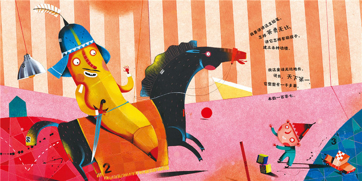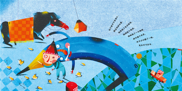 96岁高龄的任溶溶先生用童话诗的形式,讲述了一支立志写出长篇童话的小铅笔遇到了同样渴望创造力的男孩。男孩是个爱玩耍的孩子,他想起自己的同学可以把铅笔削得很尖,决心赢过同学,于是他削了一次又一次……终于,铅笔断了,进了垃圾桶。伊朗画家哈桑抓住这首诗的游戏精髓,引入象征性色彩,创造出一个兴奋、好奇、冒险的世界。蓝色象征铅笔的世界,黄色则象征男孩的理想化为泡影。诗画互现,用诙谐精悍的图画书风格,实现对童年的劝谕教化——孩子在游戏的童年,也要有目标,养成持之以恒的专注力。