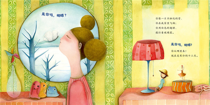寒冷的十二月,一个小女孩在自己的房间里与一只蝴蝶神奇相遇。在她梦幻般的想象中,蝴蝶开始在广阔的世界中翱翔,并再一次“羽化”。羽化,象征着新的生命的开始。《是你吗,蝴蝶》是诗人金波先生根据自己真实经历创作的诗歌,绘本图画由国际大奖画家克里斯蒂安娜·切洛蒂绘制。清丽高旷的诗句,传递着静谧与魔法的图画,带给孩子富有哲学意味的成长生命教育。这是一本梦幻、神奇而富有诗意的绘本,读者闭上眼睛,也会感受到细腻的形象;每读一遍,都可以发现图画中不易察觉的小细节。