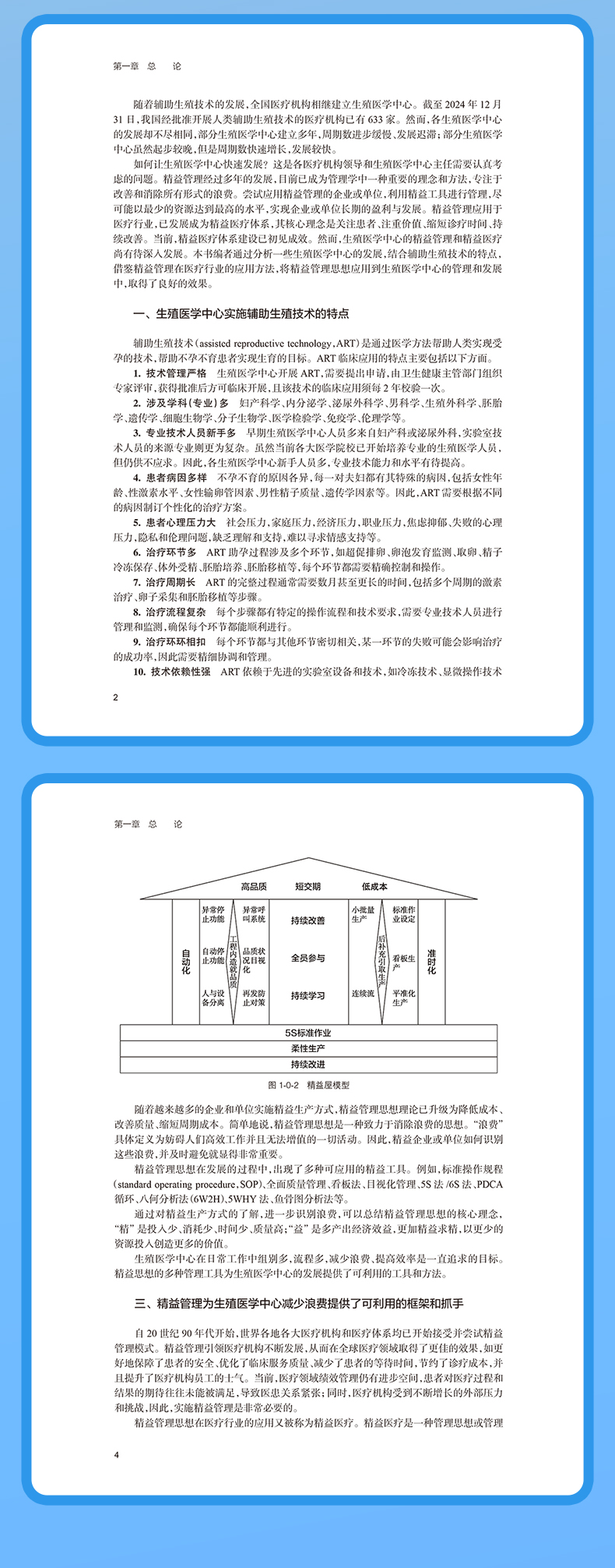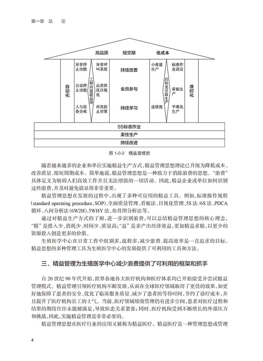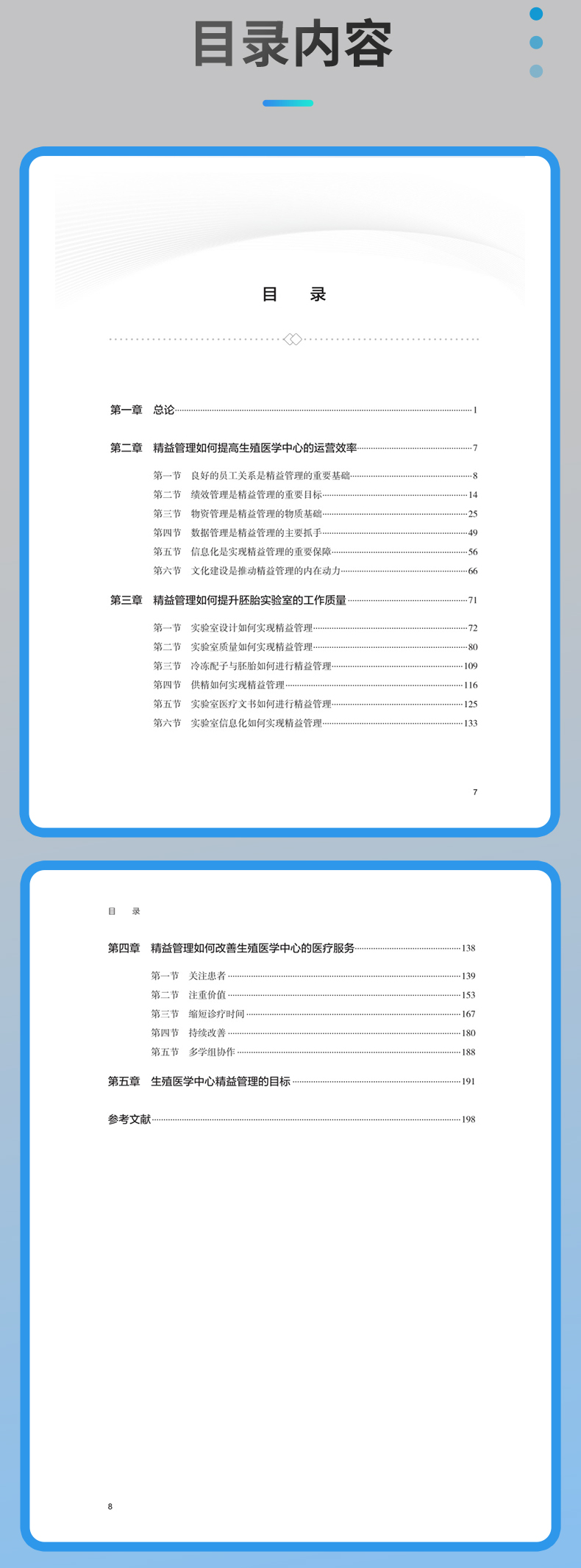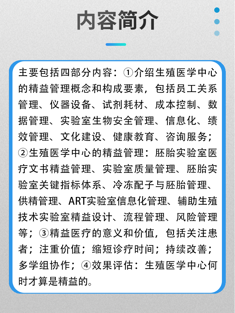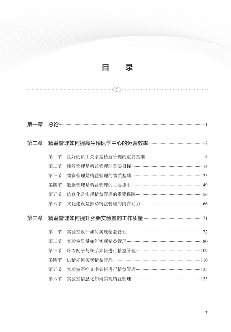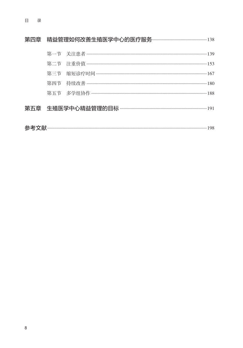 主要包括四部分内容:①介绍生殖医学中心的精益管理概念和构成要素,包括员工关系管理、仪器设备、试剂耗材、成本控制、数据管理、实验室生物安全管理、信息化、绩效管理、文化建设、健康教育、咨询服务;②生殖医学中心的精益管理:胚胎实验室医疗文书精益管理、实验室质量管理、胚胎实验室关键指标体系、冷冻配子与胚胎管理、供精管理、ART实验室信息化管理、辅助生殖技术实验室精益设计、流程管理、风险管理等;③精益医疗的意义和价值,包括关注患者;注重价值;缩短诊疗时间;持续改善;多学组协作;④效果评估:生殖医学中心何时才算是精益的。
