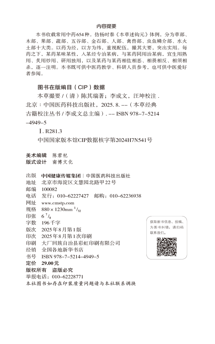 本草撮要(本草经典古籍校注丛书)(清) 陈其瑞著 李成文 汪坤校注 可供中医药教学 科研人员参考9787521449495中国医药科技出版社