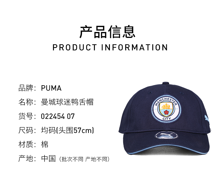 PUMA/彪马曼城球迷鸭舌帽男女同款运动帽遮阳防晒02245407