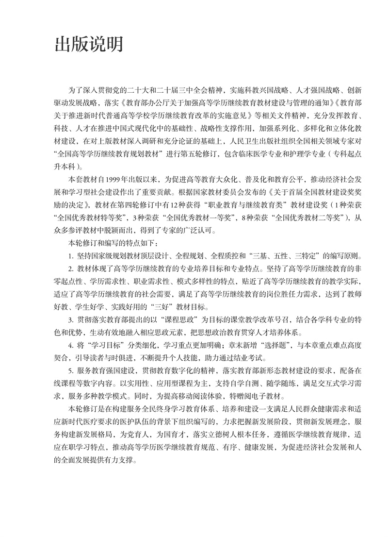 2.第五轮修订简介 本次修订包含临床医学专业和护理学专业,专科起点升本科和专本公用层次,共44种。本套教材将继续采用涵盖纸质教材、数字资源以及平台功能融为一体的“融合教材”编写模式,坚持基本理论、基本知识、基本技能和思想性、科学性、先进性、启发性、适应性,同时注重内容安排合理,深浅适宜,适应高等学历继续教育教学的需求。注重遵循医药学高等学历继续教育教学规律,体现医药学高等学历继续教育的特点。在继承和发扬上一版教材基本精神的同时,旨在提高全国高等学历继续教育教材的实用性,使更多的医疗工作人员从中受益。