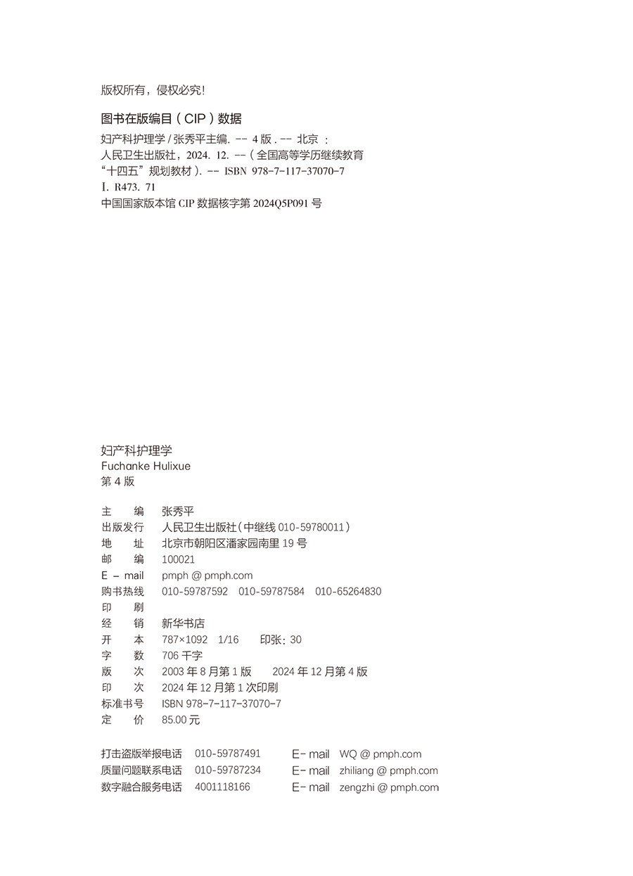 妇产科护理学 第4四版 十四五规划新形态教材 张秀平主编 供护理学类专业高等学历继续教育等使用 9787117370707人民卫生出版社