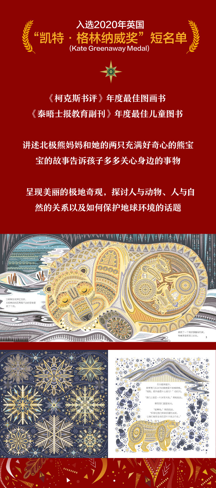 ·被评为“无价之美”的绘本。浓烈的色彩、精致的图案和充满诗意的故事,令人惊叹的美!呈现了美丽的极地奇观,探讨人与动物、人与自然的关系,