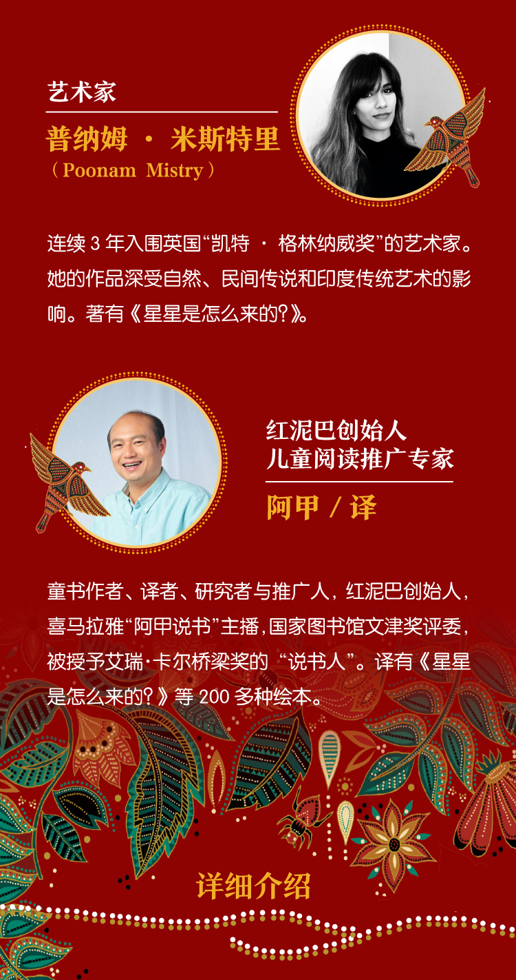 普纳姆·米斯特里(Poonam Mistry)  印裔英国人,艺术家,拥有平面设计和插画专业学位。她的作品深受自然、民间传说和印度传统艺术的影响。著有《星星是怎么来的?》。